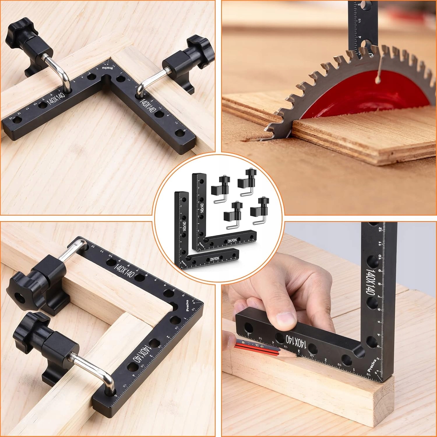 - 【Простий у використанні】Професійні деревообробні інструменти, просто розташуйте кутову скобу в кутку двох частин, які потрібно з’єднати під прямим кутом, і зафіксуйте її затискачами. Цей набір кутника та затискачів зробить вашу роботу зручнішою.