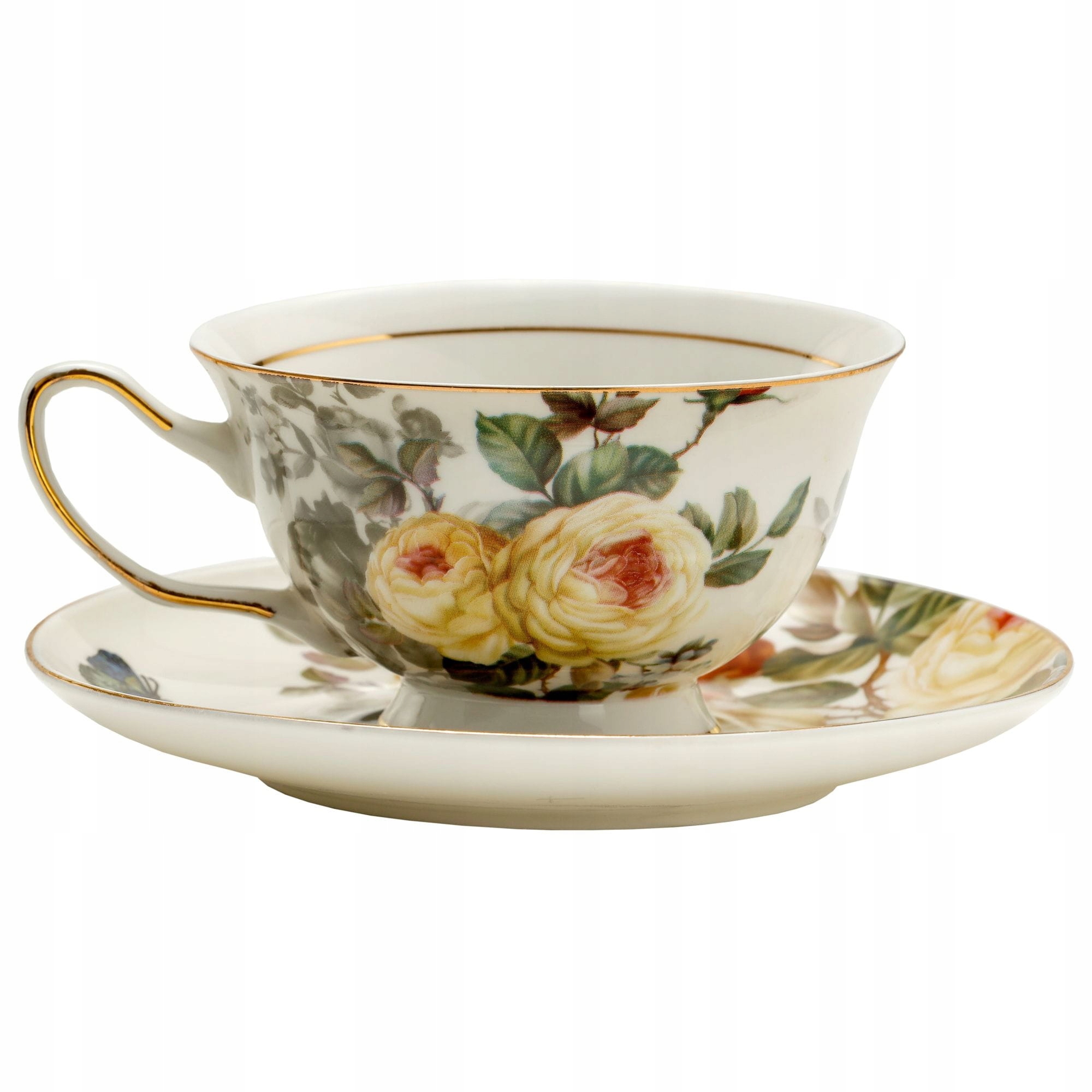 Традиційна чайна чашка Roses із блюдцем, виготовлена з якісної кістяної порцеляни, тобто «Fine Bone China», з гарним квітковим мотивом, з ніжною позолотою на краях чашки та блюдця.