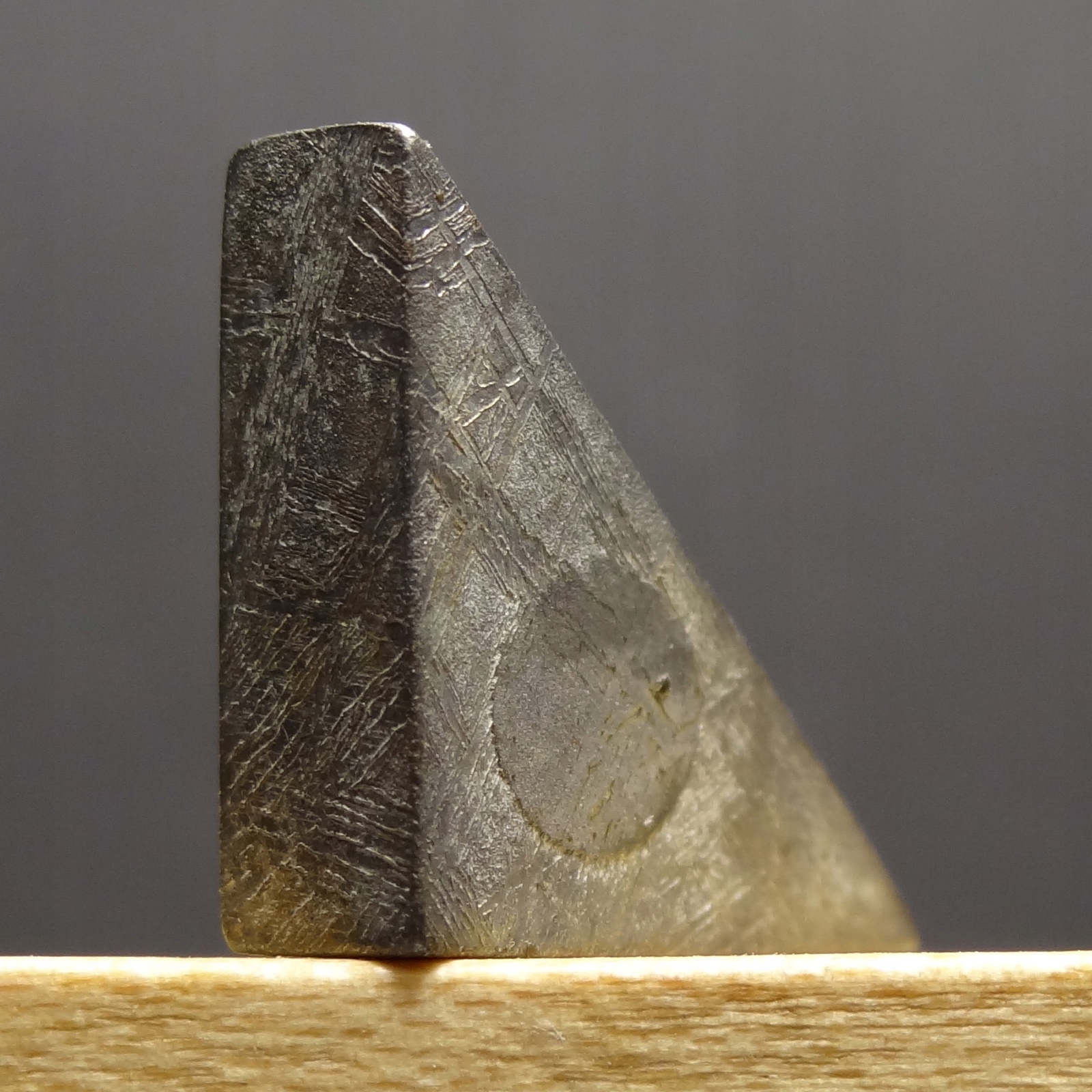 Вирізаний фрагмент метеорита. Фігури Відманштеттена дуже чітко видно (характерний візерунок паралельних ламелей камациту та теніту).