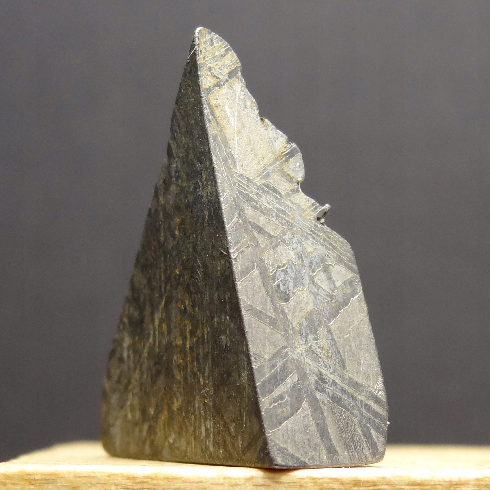Вирізаний фрагмент метеорита. Фігури Відманштеттена дуже чітко видно (характерний візерунок паралельних ламелей камациту та теніту).