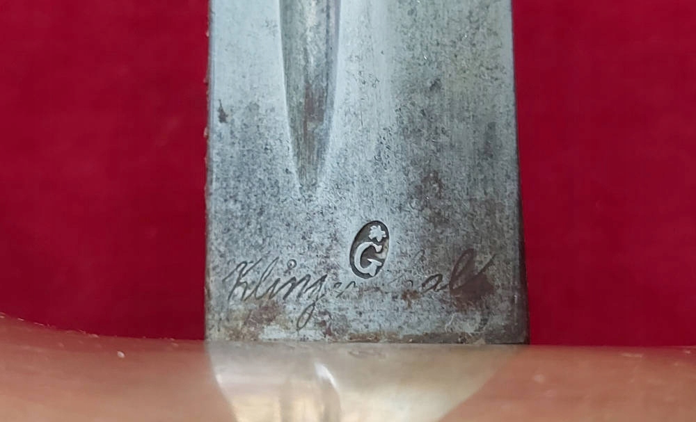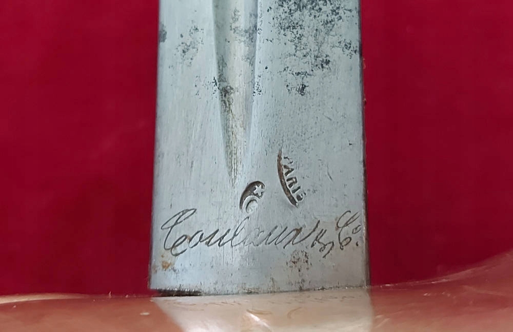Копія, видна на фотографіях, дуже добре збережена. Лезо, не торкалося. На порозі французькі підписи, трохи розмиті, можна побачити, серед інших klingenthal , а з іншого боку coulaux . Сім'я Coulaux купила Королівський фабрику Клінентала в 1838 році. Світильник ручки - латунь. Вал ручки - рогівка. Ручка не влаштована, не існує слабкої.