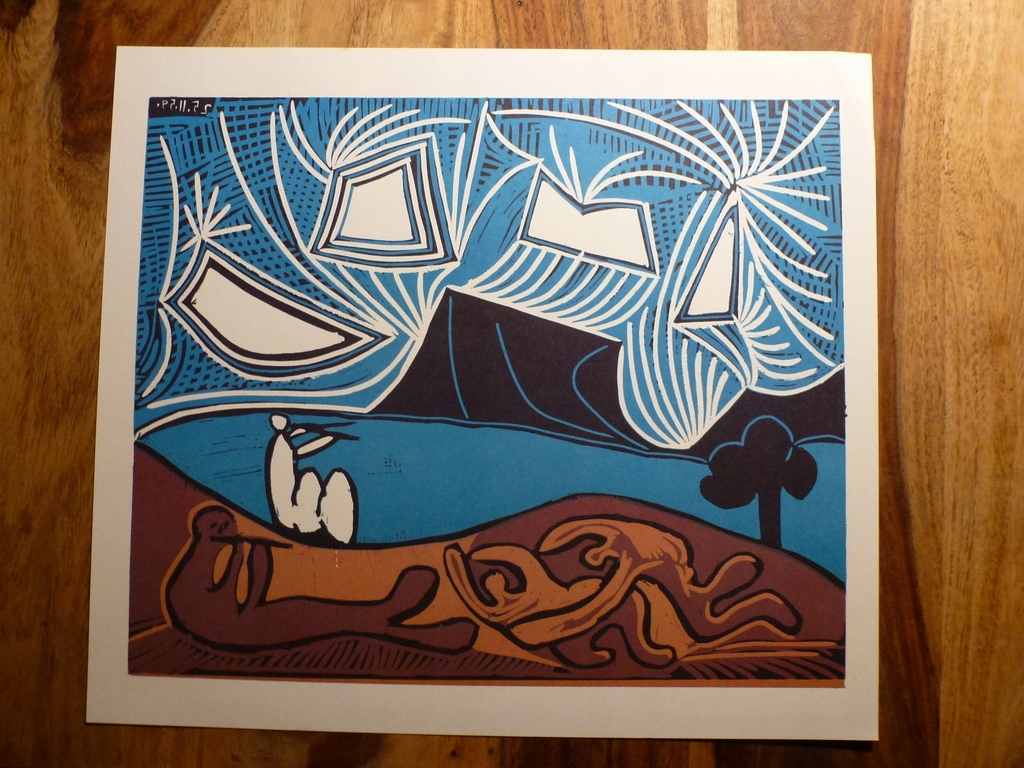 Я пропоную офсетну літографію, видану в 1988 році Harry N. Abrams Inc., Нью-Йорк, яка ілюструє серію «Ліногравюри» Пабло Пікассо. Ілюстрація, опублікована на старому щільному папері, друга сторона не надрукована. Видання надруковано в Японії. Товар не була в рамці - складка в правому верхньому куті(фото).