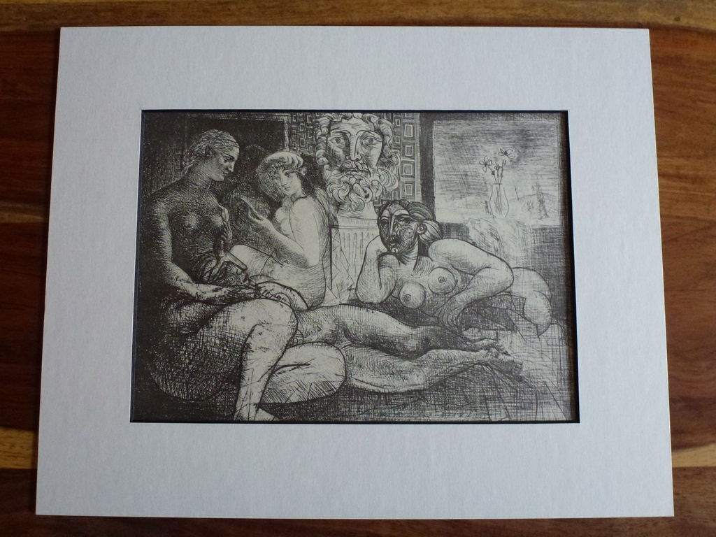 я маю запропонувати ілюстрацію Пабло Пікассо (1881-1973), опубліковану Ґердом Хатьє, Штутгарт, із серії «Сюїта Воллара», видання, опубліковане за життя та за згодою художника в 1956 році на папері ручної роботи «з років». Ілюстрація оформлена в паспарту підготовлено для попередньо визначених рамок розміром 30 см x 24 см.Друга сторона аркуша чиста.