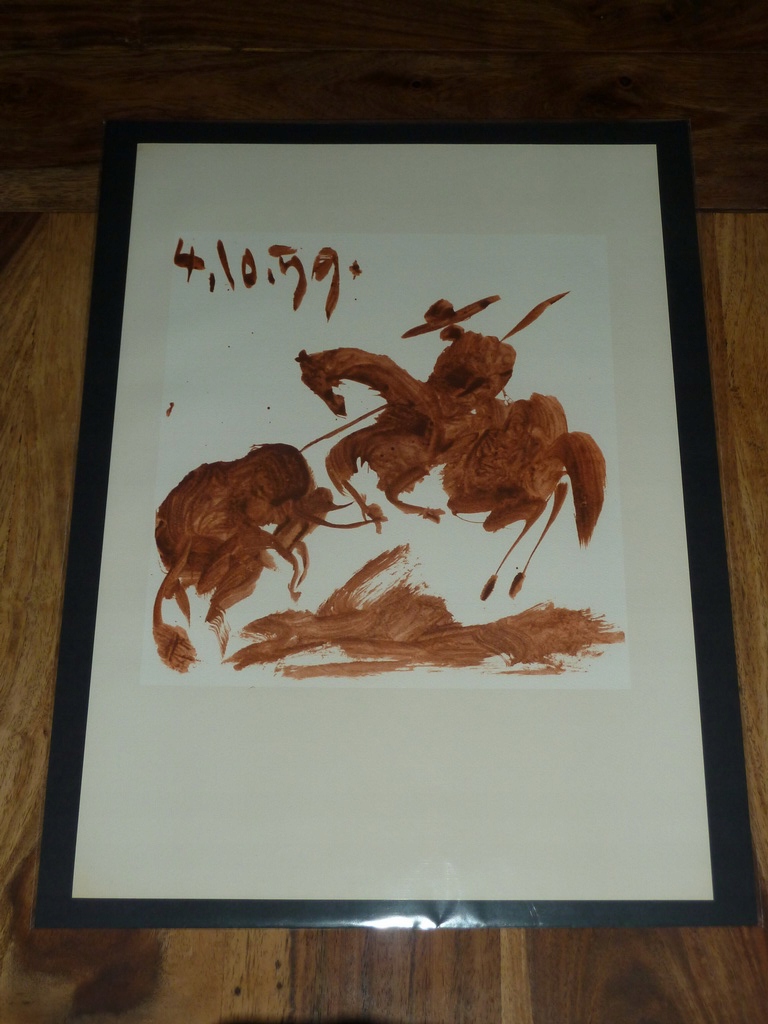 Я хочу запропонувати офсетну літографію, опубліковану в 1961 році Banca Popolare di Milano (Мілан, Італія), яка ілюструє серію Пабло Пікассо «Toros y Toreros» (Бики та тореадори). Це рідкісне італійське перше видання серії 1961 року (опубліковано за згодою та за життя автора). За друк відповідає студія Mourlot у Парижі. Видання на якісному акварельному папері Arches, з іншого боку аркуша ще одна ілюстрація з цієї ж серії. Предмет ніколи не оформлявся в рамки, у дуже хорошому стані.