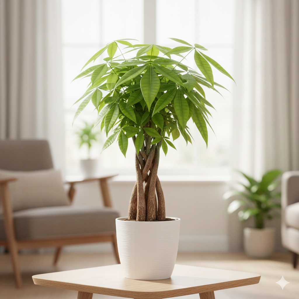 Pachira aquatica, більш відома як Дерево Щастя або Грошове Дерево, є однією з найпопулярніших і бажаних кімнатних рослин. Відрізняється характерним плетеним стовбуром і пишною, схожою на пальму, кроною з пишним зеленим листям.
