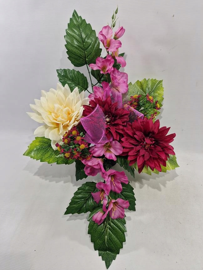 Набір виготовлено зі штучних квітів у горщику, заповненому бетоном.
