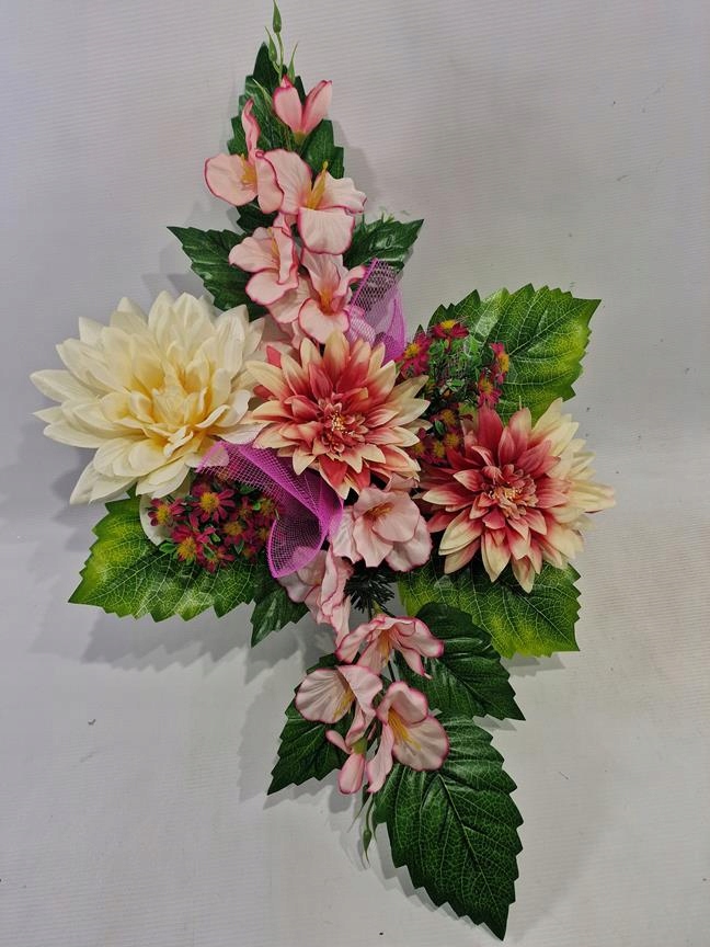 Набір виготовлено зі штучних квітів у горщику, заповненому бетоном.