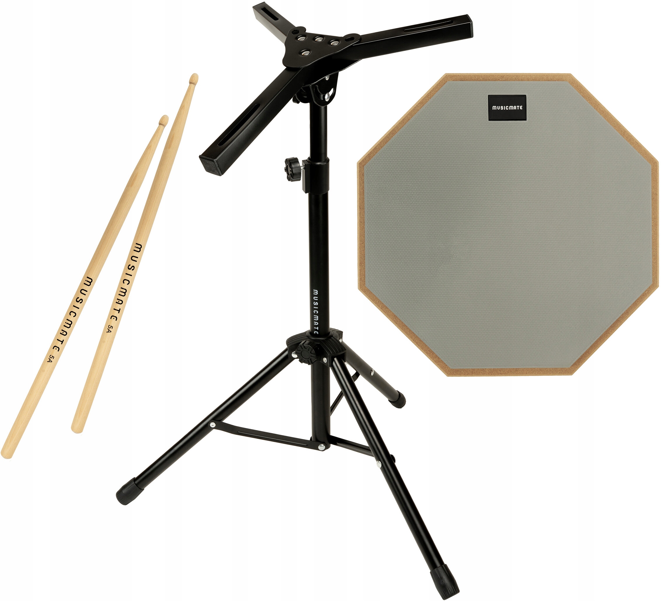 Набір включає барабанні педаль MUSICMATE MM-DRM25 PercuPad, барабанні палички, підставку, обкладинку та документацію.