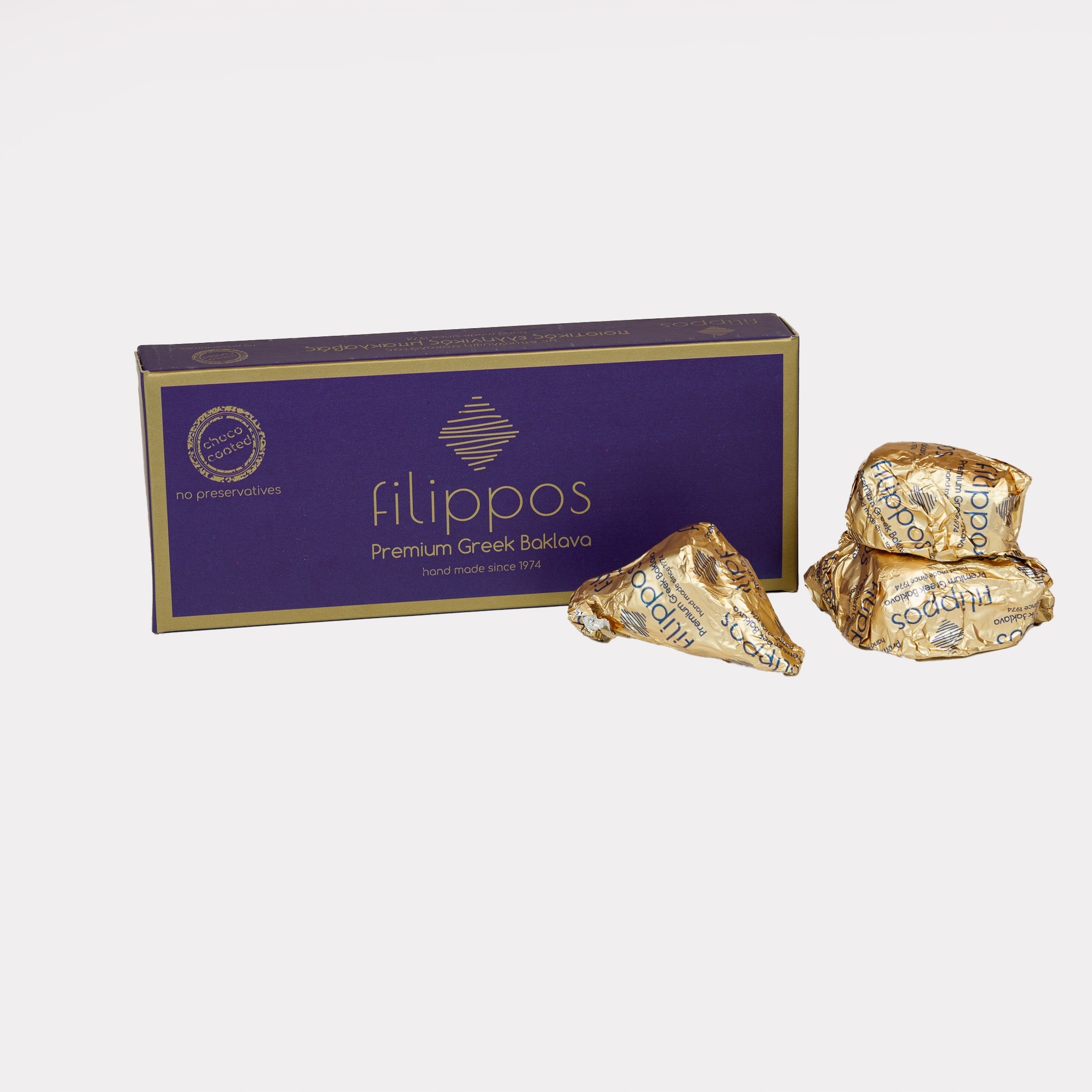 Грецька пахлава в чорному шоколаді ручної роботи сімейної фабрики Філіппос – унікальний делікатес, що поєднує традиції з сучасністю. Кожен шматочок цієї пахлави – це гармонійне поєднання хрустких прошарків філо, горіхів та ароматного сиропу, а тепер ще й вкрите смачним шоколадом. Завдяки ручному виробництву від Filippos кожна деталь ретельно контролюється, що гарантує найвищу якість та автентичний смак грецької кухні. Ця пахлава – це не лише вишукана насолода для смаку, а й символічна подорож крізь смаки та аромати традиційної грецької кухні. Ідеально підходить для особливих випадків або як смачне частування на кожен день, ця пахлава з темного шоколаду обов’язково порадує кожного, хто спробує її унікальний смак.