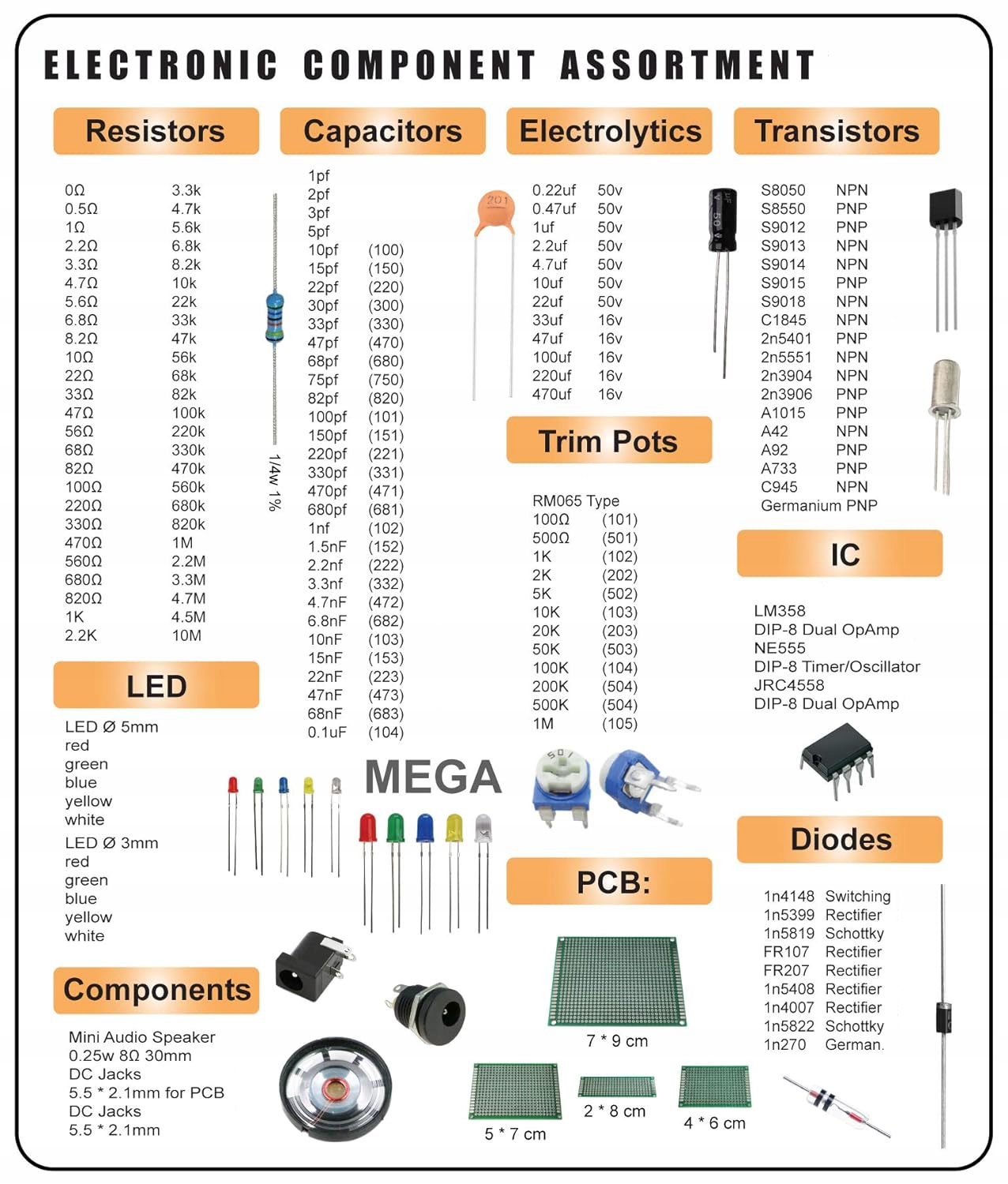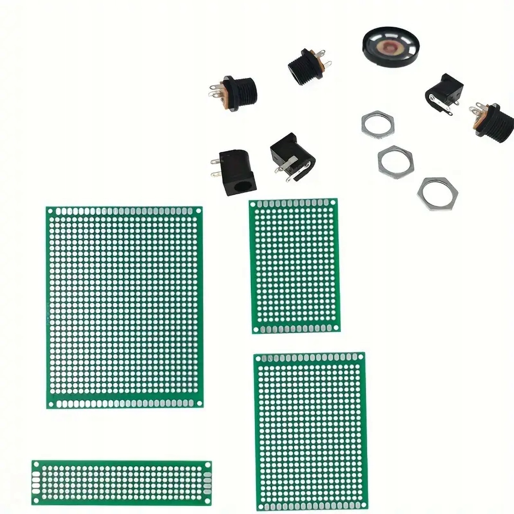 1000 шт. резисторів 170 шт. транзисторів, 120 шт. конденсатори електролітичні 100 шт. діодів 200 шт. Світлодіоди 3 мм і 5 мм, 310 шт. конденсатори керамічні 3 шт. розетки DC-022, 3 шт. Розетки DC-005 2 шт. LM358, 2 шт. NE555, 2 шт. JRC4558, 1 мініколонка, 2 шт. Германієві діоди 1N270 2 шт. германієві транзистори 12 шт. регулювальні потенціометри, 4 шт. Плати