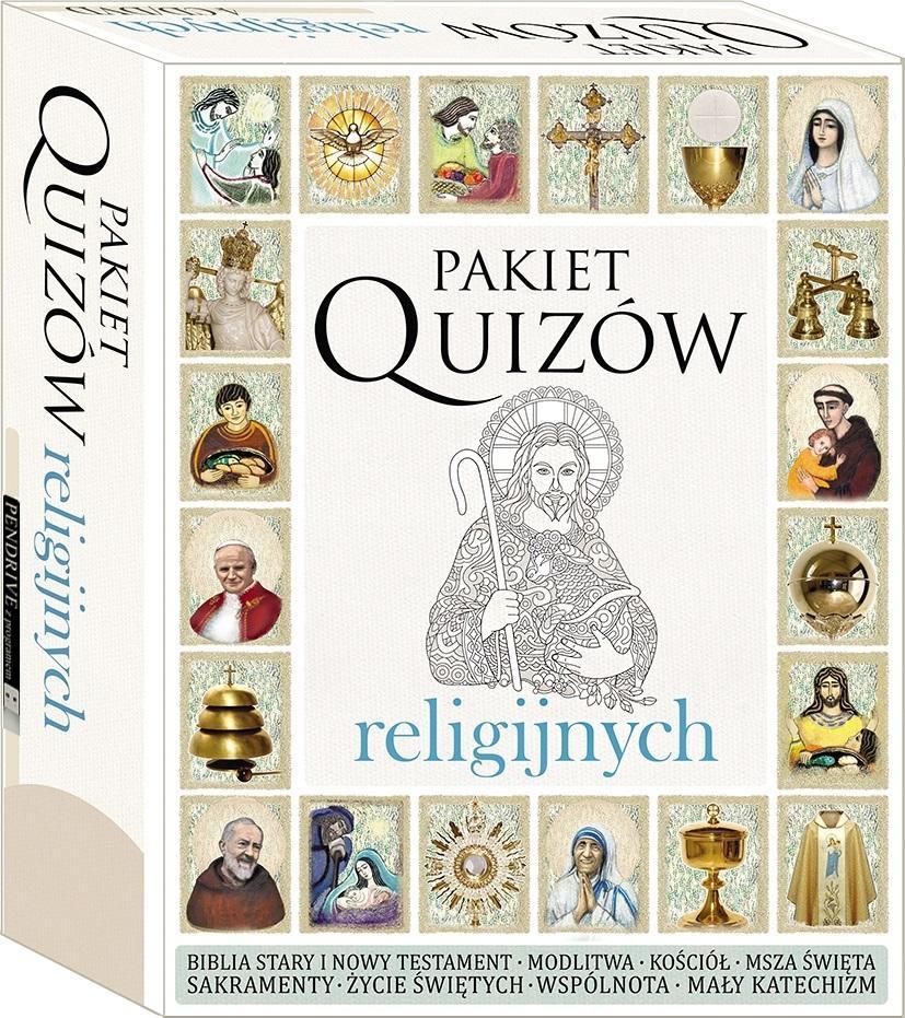 Пакет релігійних вікторин PENDRIVE Видавництво Pasterz Вимоги до апаратного забезпечення: Комп’ютер із Windows Media: флешка Флешка містить чотири мультимедійні програми: Комп’ютерна біблійна вікторина Старий і Новий Заповіт Найкрасивіші та найважливіші історії, найбільше герої Біблії. Вікторина про Святу Церкву Свята Меса, таїнства, Малий Катехизм, молитви, спільнота, літургійний рік, архітектура храму та обладнання. Комп'ютерна вікторина про святих, частина 1 і частина 2 Життя і труди понад шістдесяти святих і блаженних Церкви. Їх незвичайна доля і захоплюючий шлях, яким вони пройшли до раю. Серед святих: св. Іван Павло ІІ, св Падре Піо, святий Фаустина Ковальська, св Максиміліан Кольбе, св Мати Тереза з Калькутти та багато інших. Комп’ютерні вікторини дозволяють отримати достовірні знання з багатьох тем, пов’язаних з релігією, Біблією та Церквою, у новий і надзвичайно привабливий спосіб. - програми містять понад 3000 питань. - Поділ питань на простіші та складніші. - Доступна опція вікторини на час. - Можливість роздрукувати запитання про святих і Церкву разом із ключем правильних відповідей. - Десятки додаткових навчальних ігор, у тому числі: кросворди, головоломки, загадки, підбір пар тощо. - Вибір опції, яка дозволяє грати з іншою особою або грати між групами. - Словник слів, пов'язаних з церквою, життєписні таблиці святих. Релігійні вікторини - навчальна гра для всієї родини. Їх також можна використовувати як катехитичний посібник під час уроків релігії, зустрічей вівтарників або під час реколекцій. Пакет релігійних вікторин може стати чудовим подарунком до Першого Святого Причастя, Конфирмації, дня народження, іменин.
