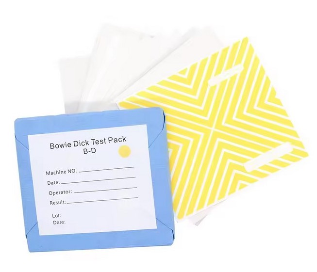 Тест Bowie & Dick — це картка з досліджуваною речовиною, розміщена між аркушами спеціального паперу, ламінату та піни.