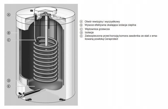 - Стійка до корозії сталева камера резервуара з емальованим покриттям Ceraprotect. Додатково забезпечується катодний захист магнієвим анодом, захисний титановий анод входить до складу додаткового обладнання.