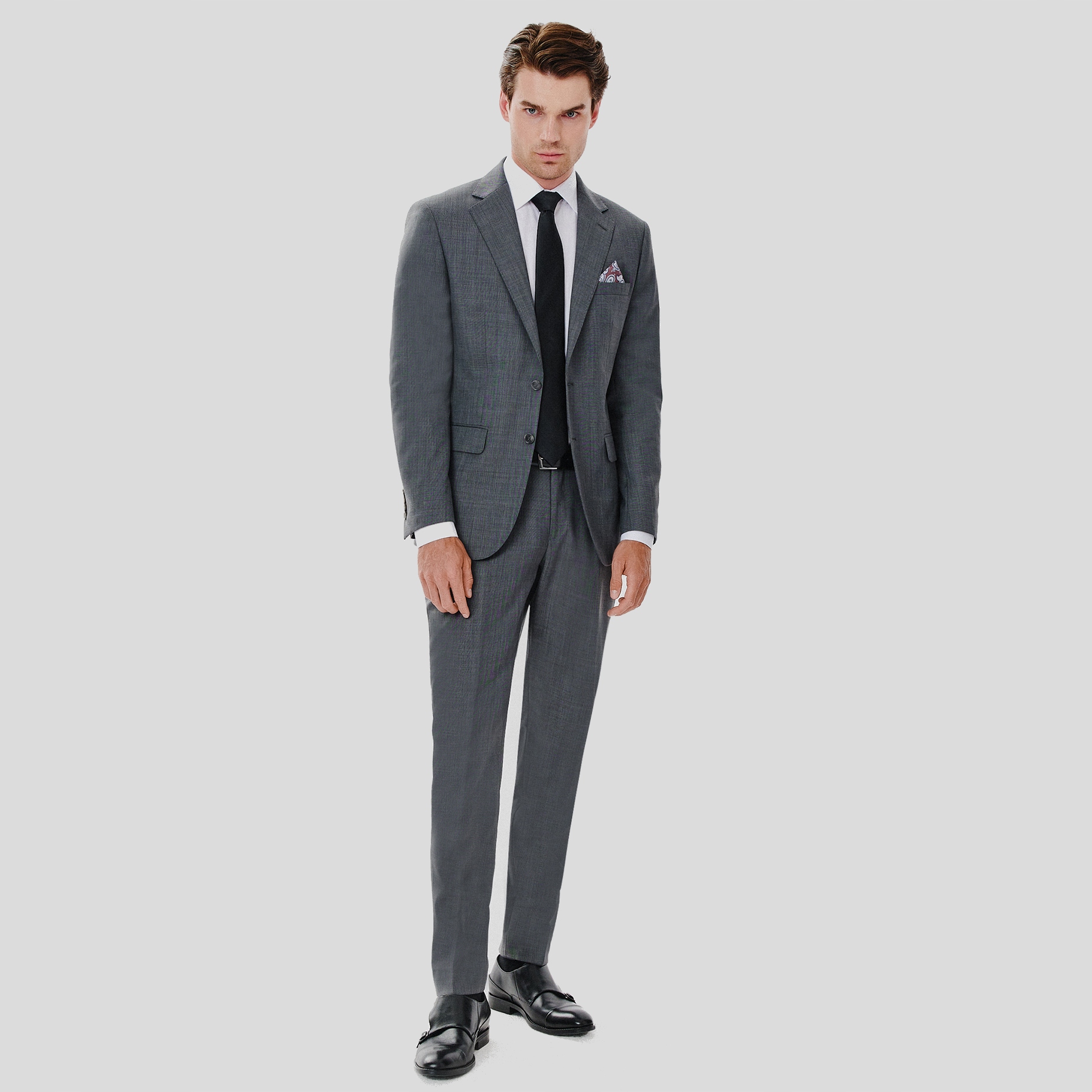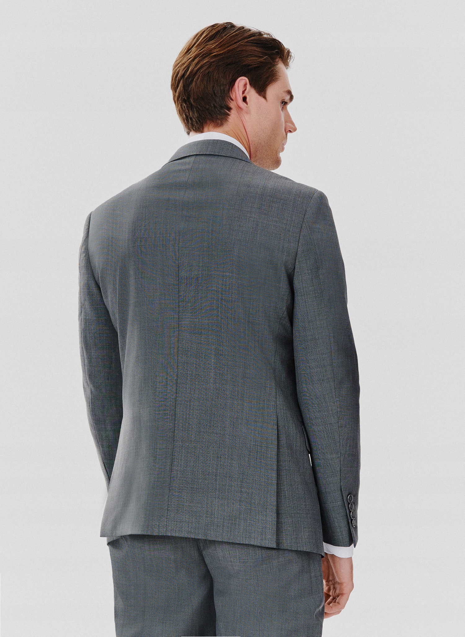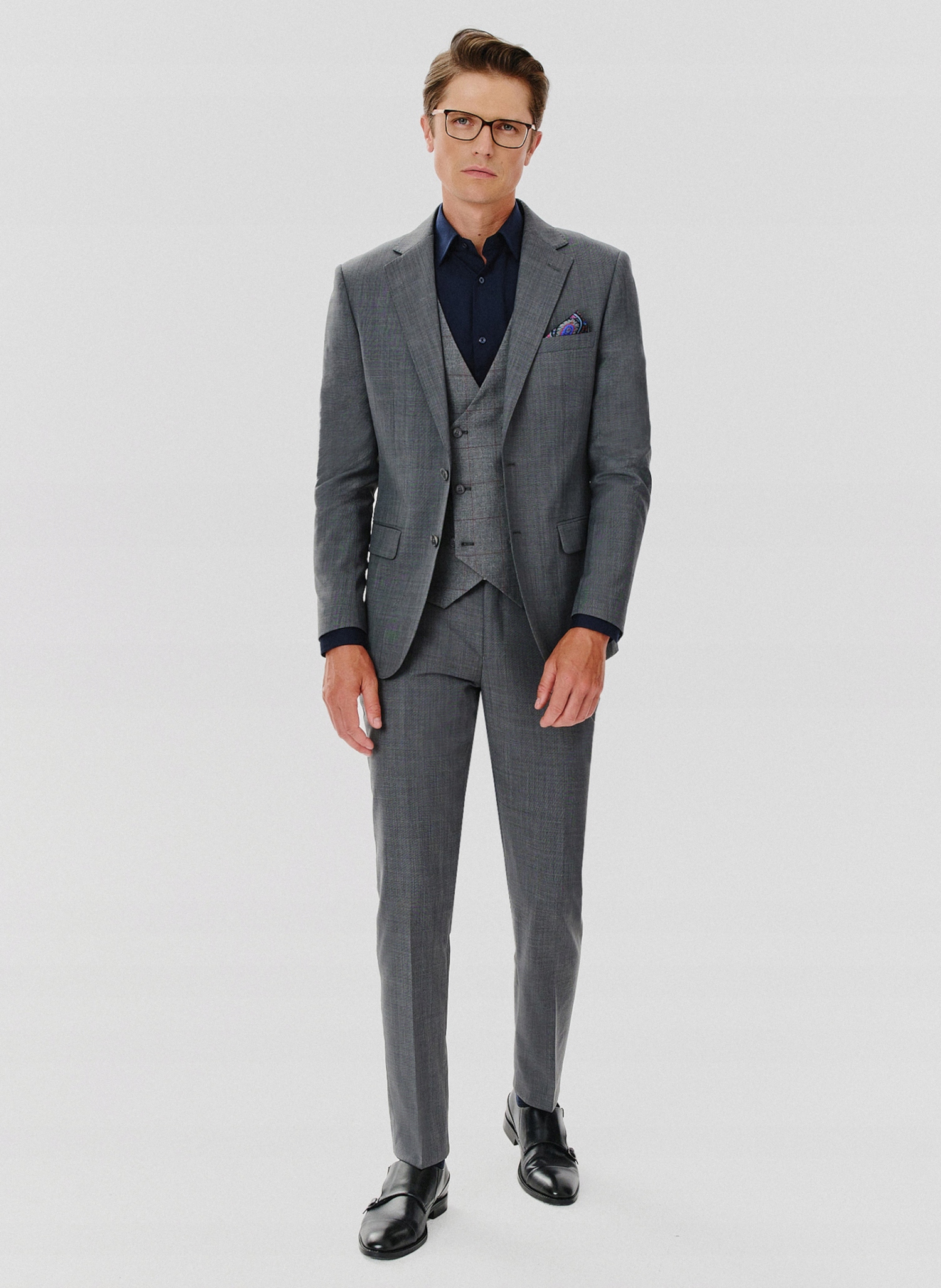 Гладкий сірий чоловічий костюм з колекції Pako Lorente. Такий універсальний колір і візерунок підійдуть на багато випадків! Піджак має дві кишені з клапанами та складкою зліва на рівні грудей, яку слід доповнити кишеньковим квадратом з малюнком. Застібається на дві гудзики одного кольору. На задній частині куртки є дві розрізи, які забезпечують свободу рухів. Рукава жакета оброблені чотирма маленькими гудзиками. Костюм Super Slim ідеально підкреслює чоловічу фігуру та оптично її струняє. Штани, запресовані в складку, злегка звужені донизу, додають елегантності та офіційності. Застібка штанів на блискавку, кнопку і гачок запобігає випадковому розстібанню штанів. Верх штанів оброблений шлевками. До сірого костюма найкраще додати коричневі туфлі і ремінь. Такий стиль буде виглядати елегантно і бездоганно. І штани, і піджак можна носити окремо для повсякденного образу.