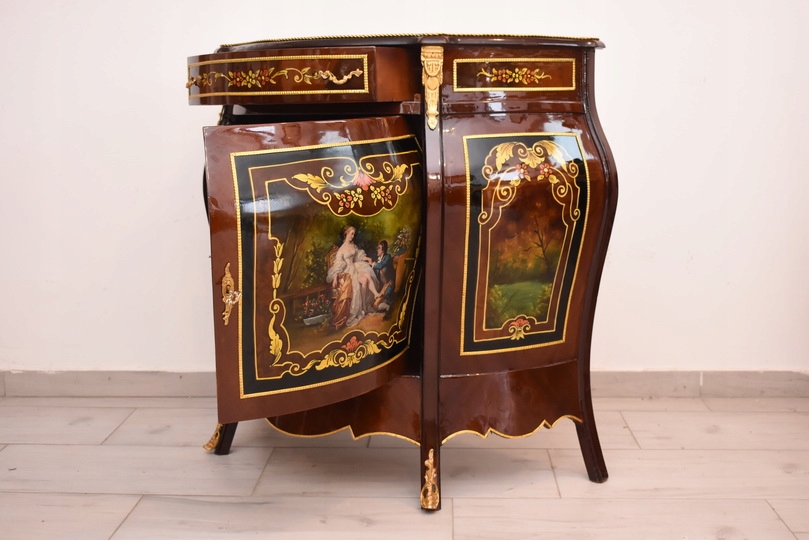 Неймовірно красива комода, численно прикрашена фурнітурою, яка додає меблів чудовий шарм. Він просторий ящик та 2 полиці