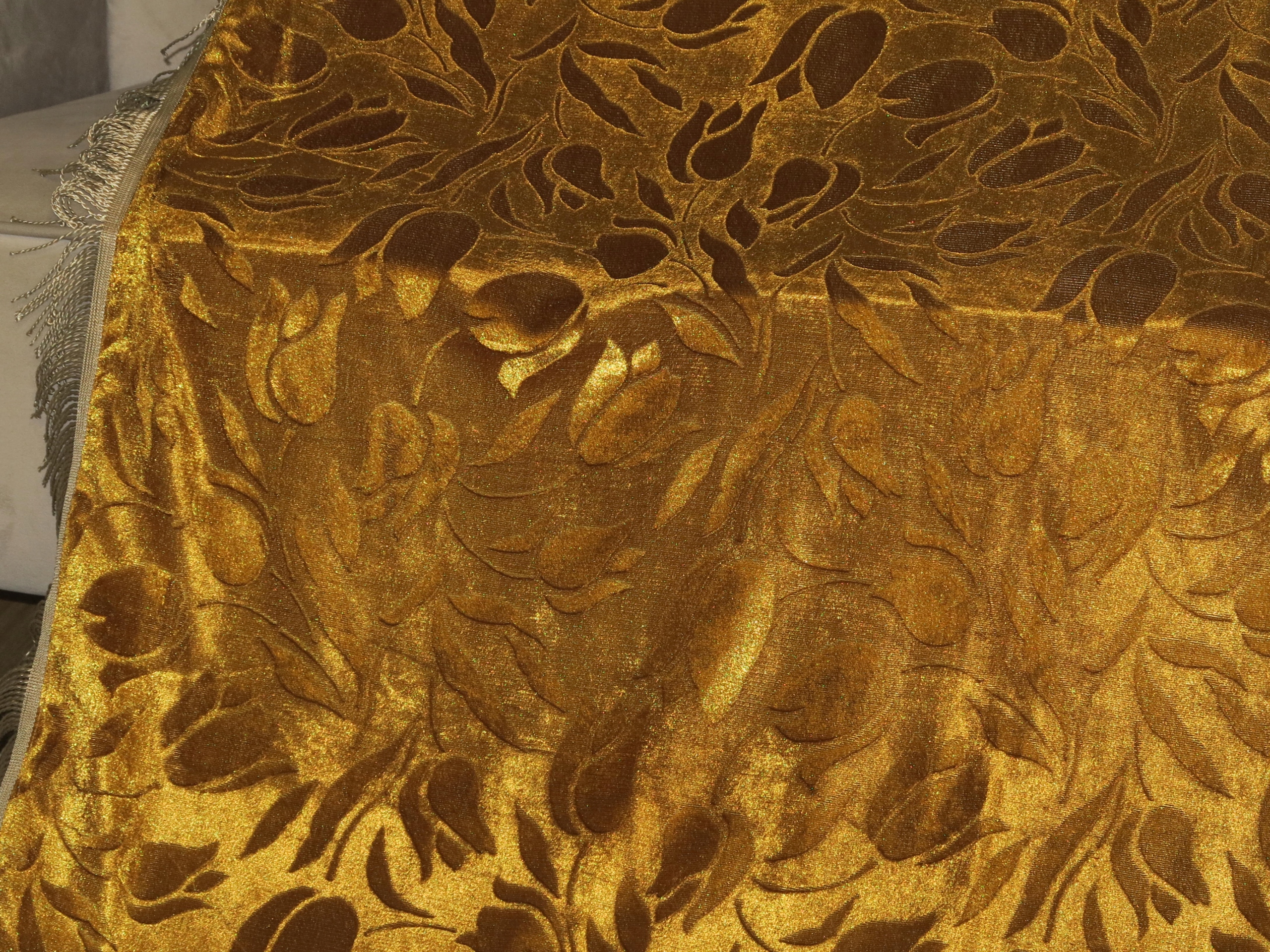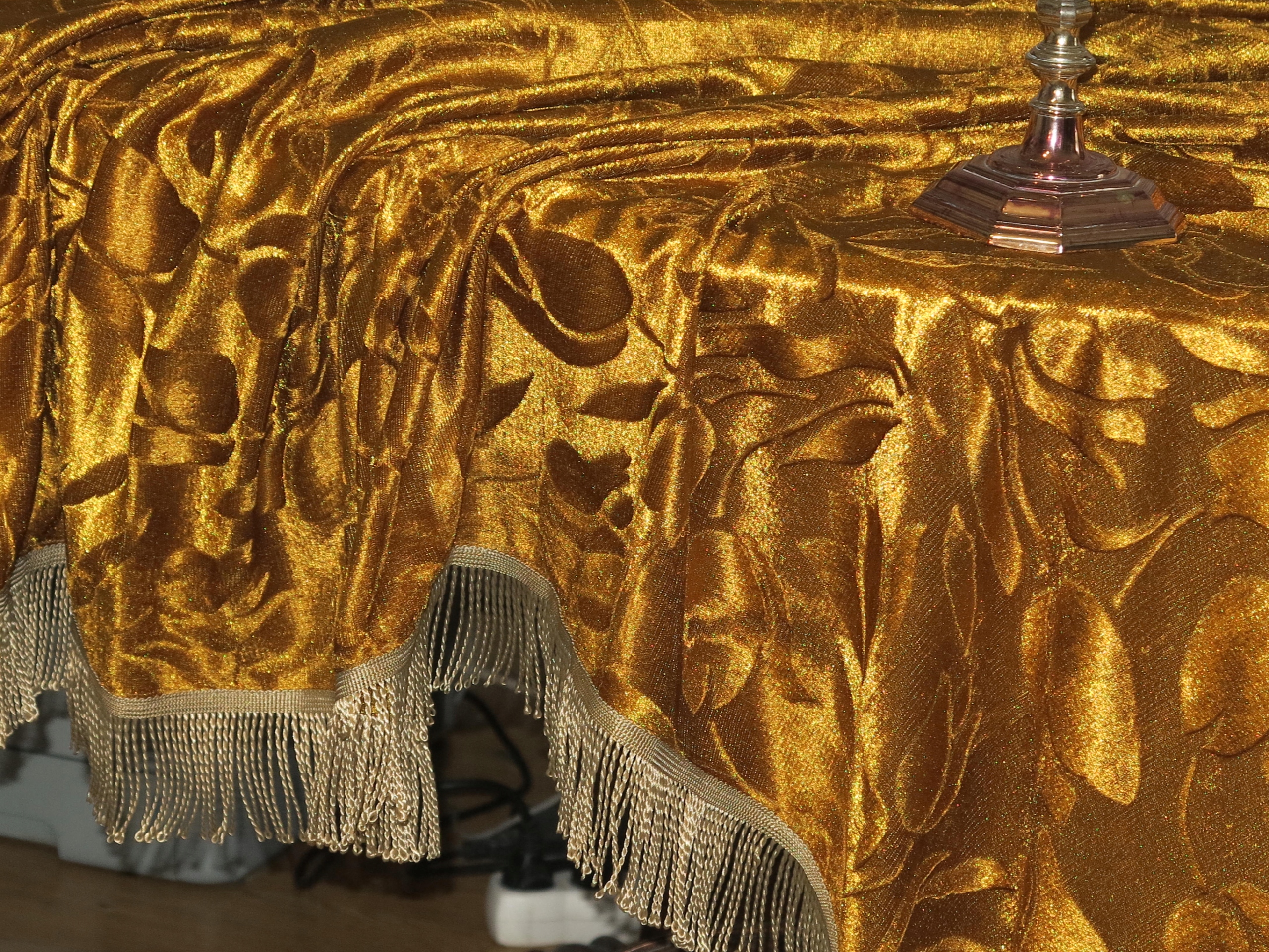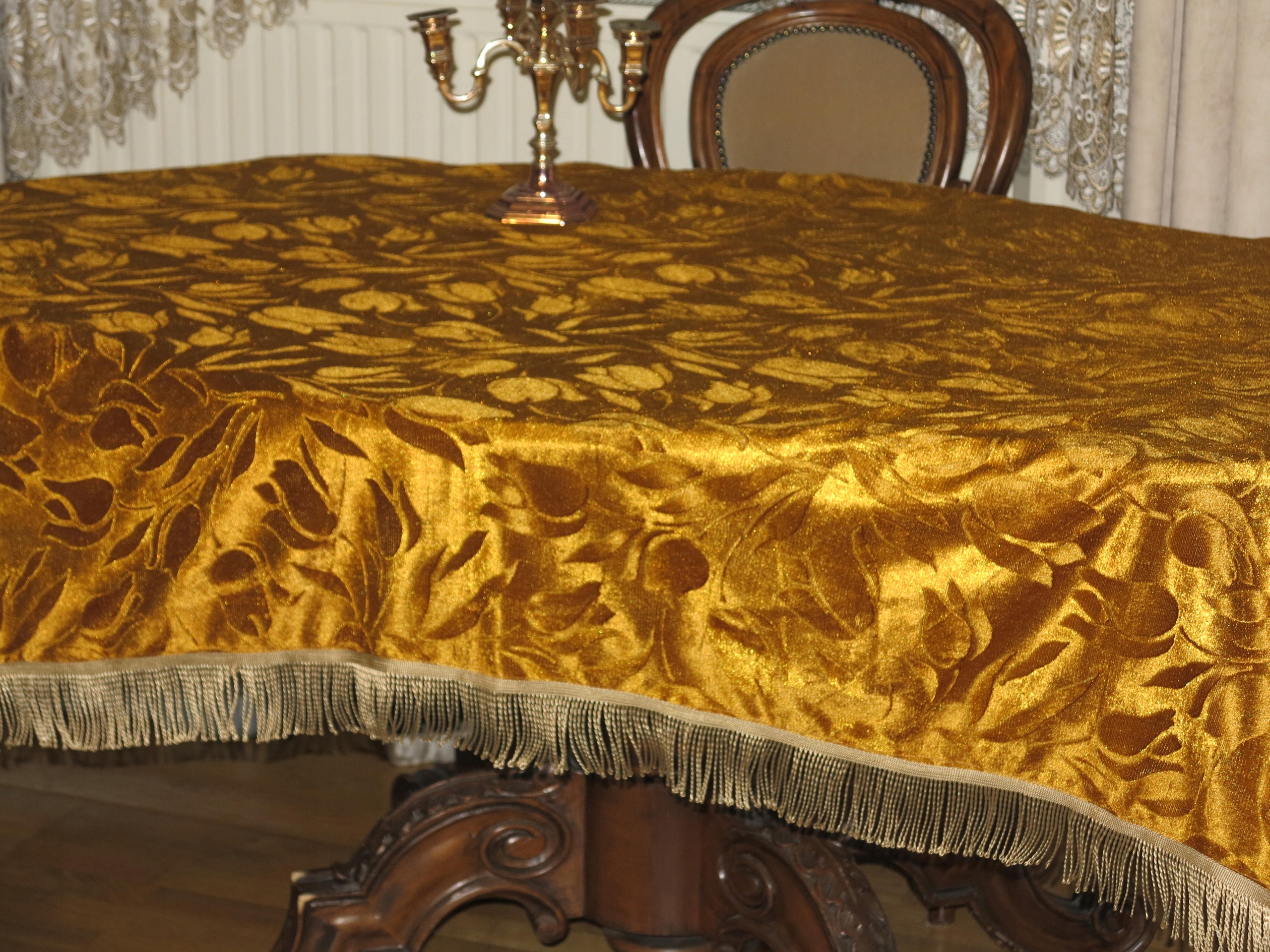 , дуже велика скатертина, виготовлена з м'ясистого оксамитового оксамиту з експресивним золотом. На тканині виготовляється тюльпановий малюнок. Про золоті довгі бахроми