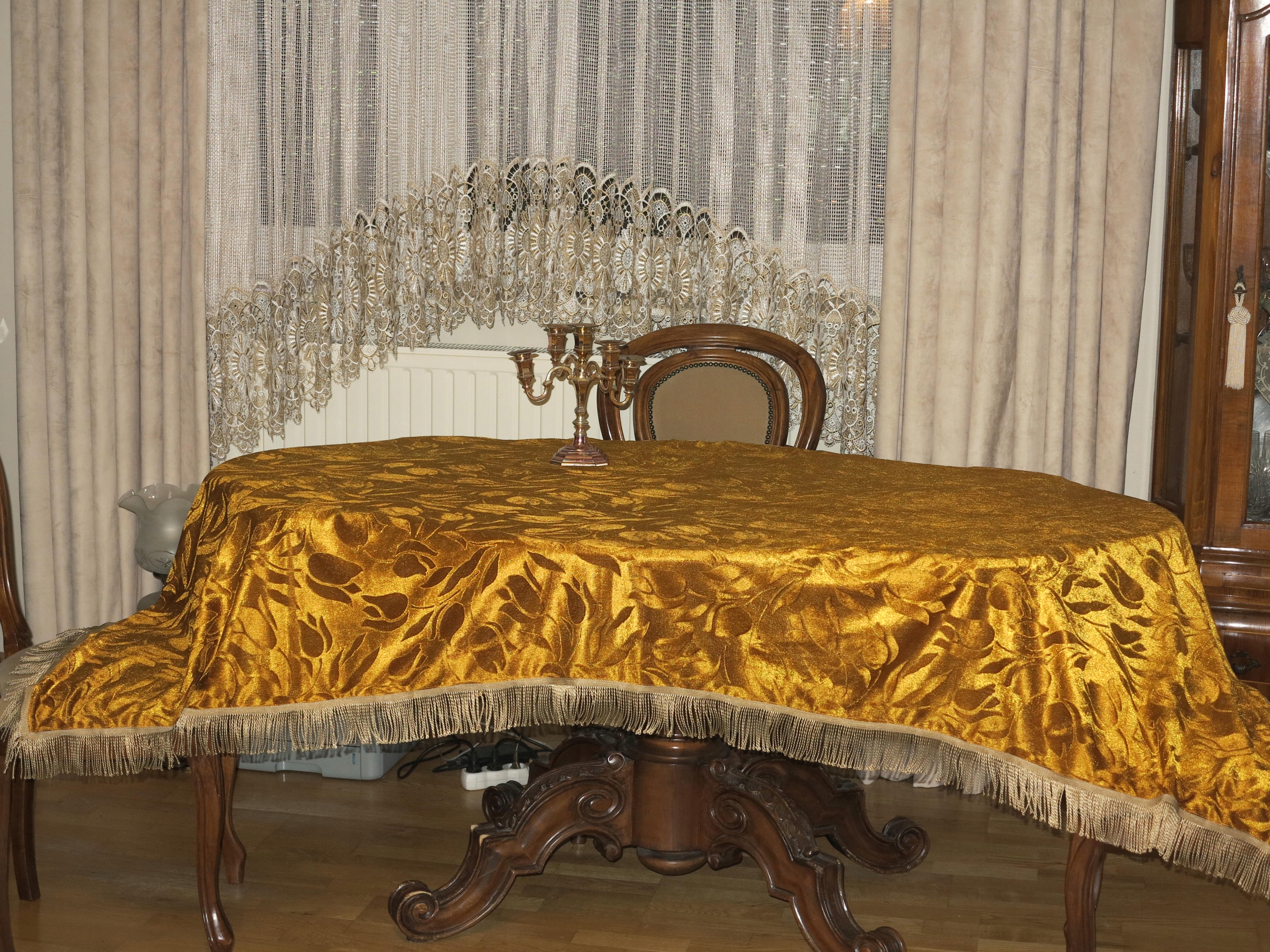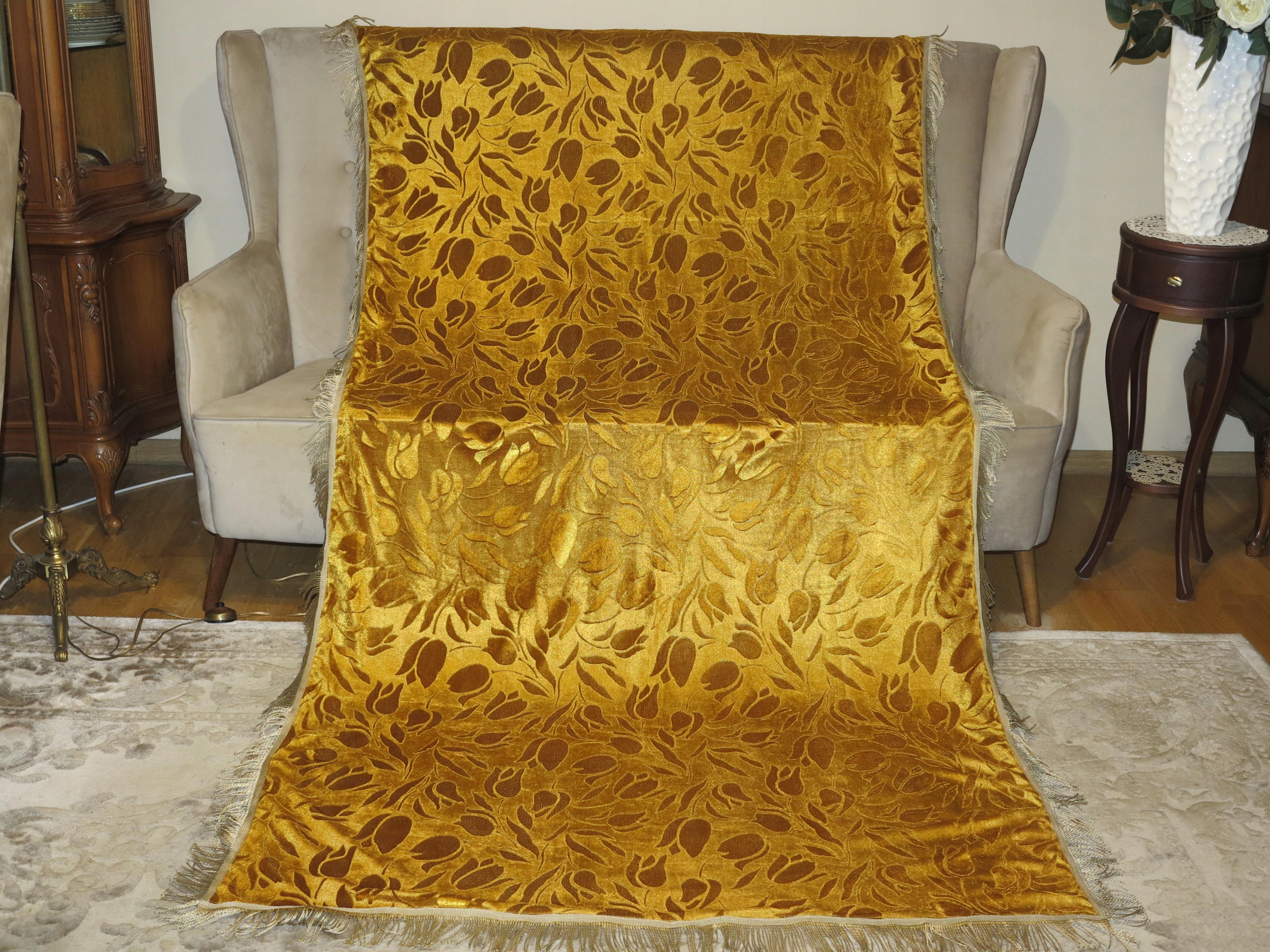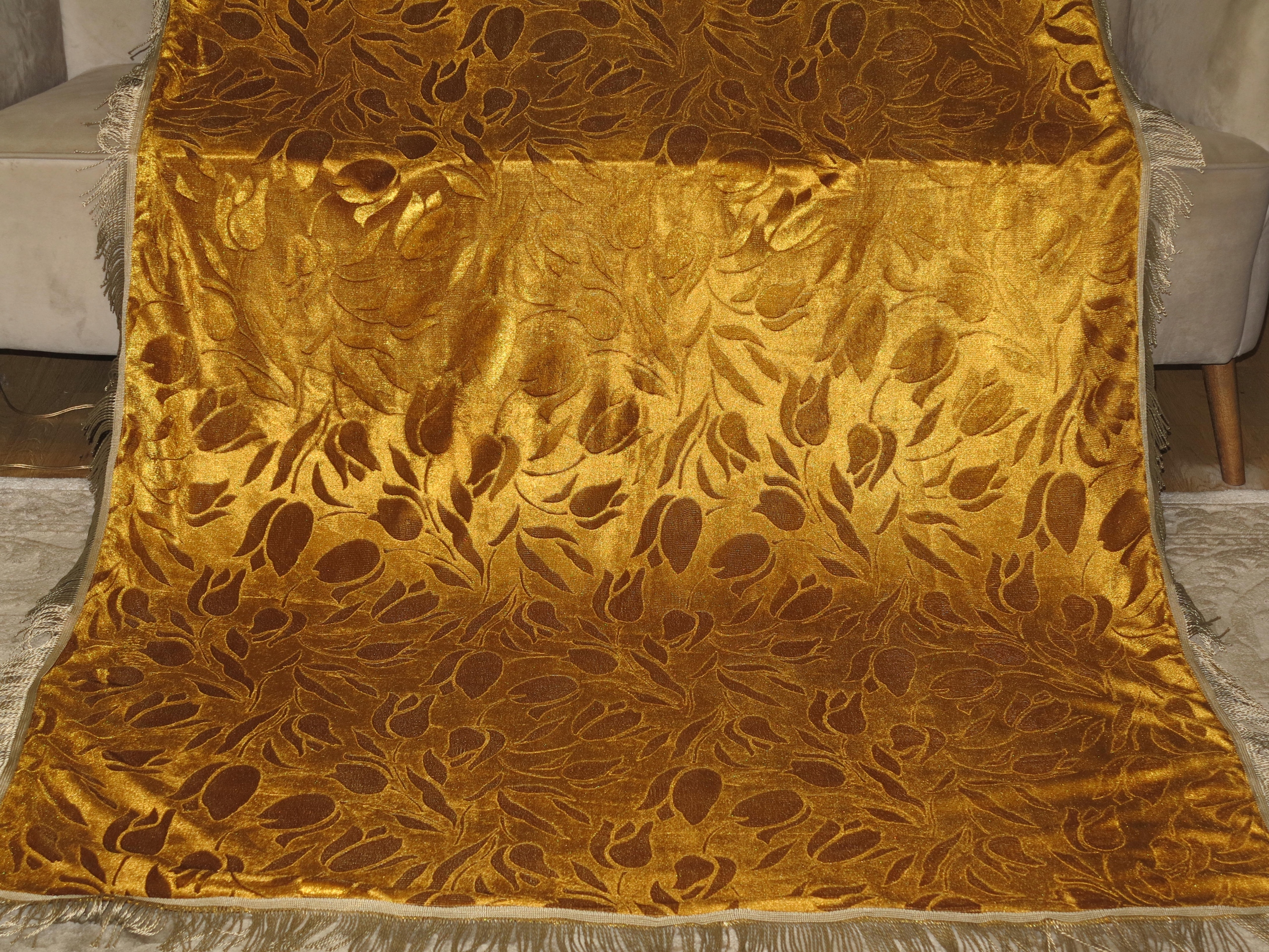 , дуже велика скатертина, виготовлена з м'ясистого оксамитового оксамиту з експресивним золотом. На тканині виготовляється тюльпановий малюнок. Про золоті довгі бахроми