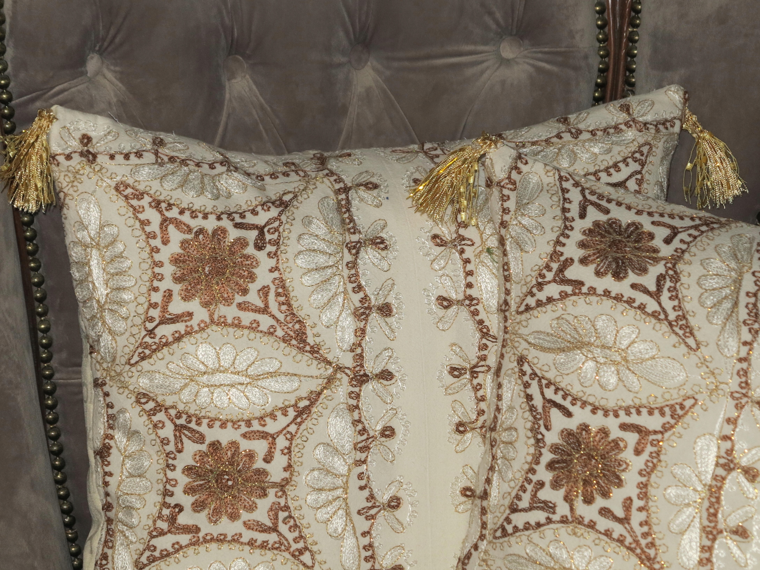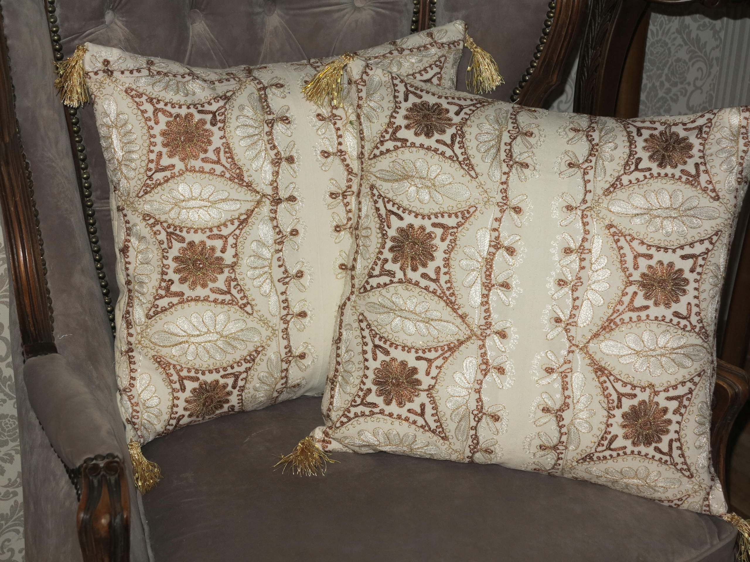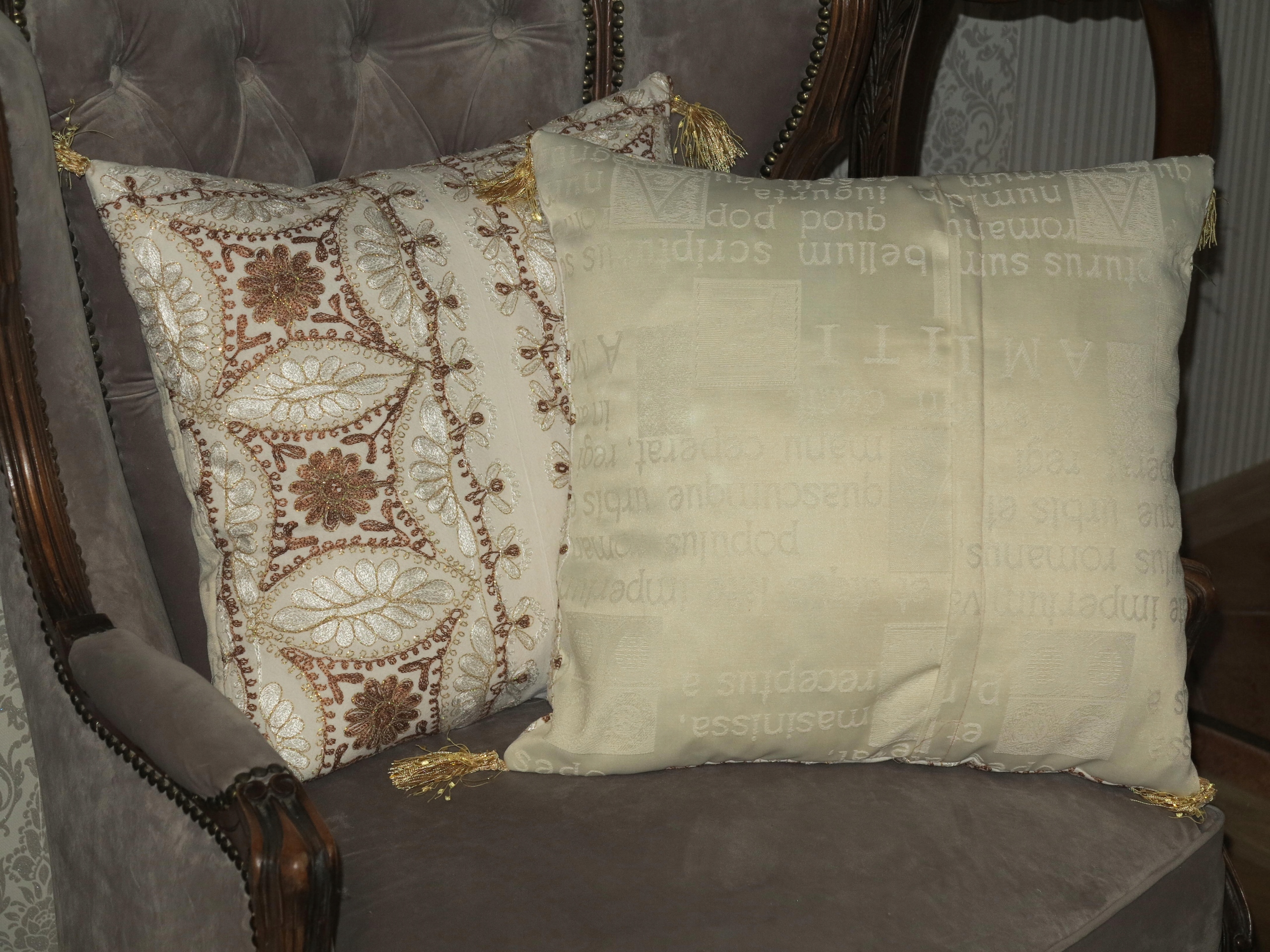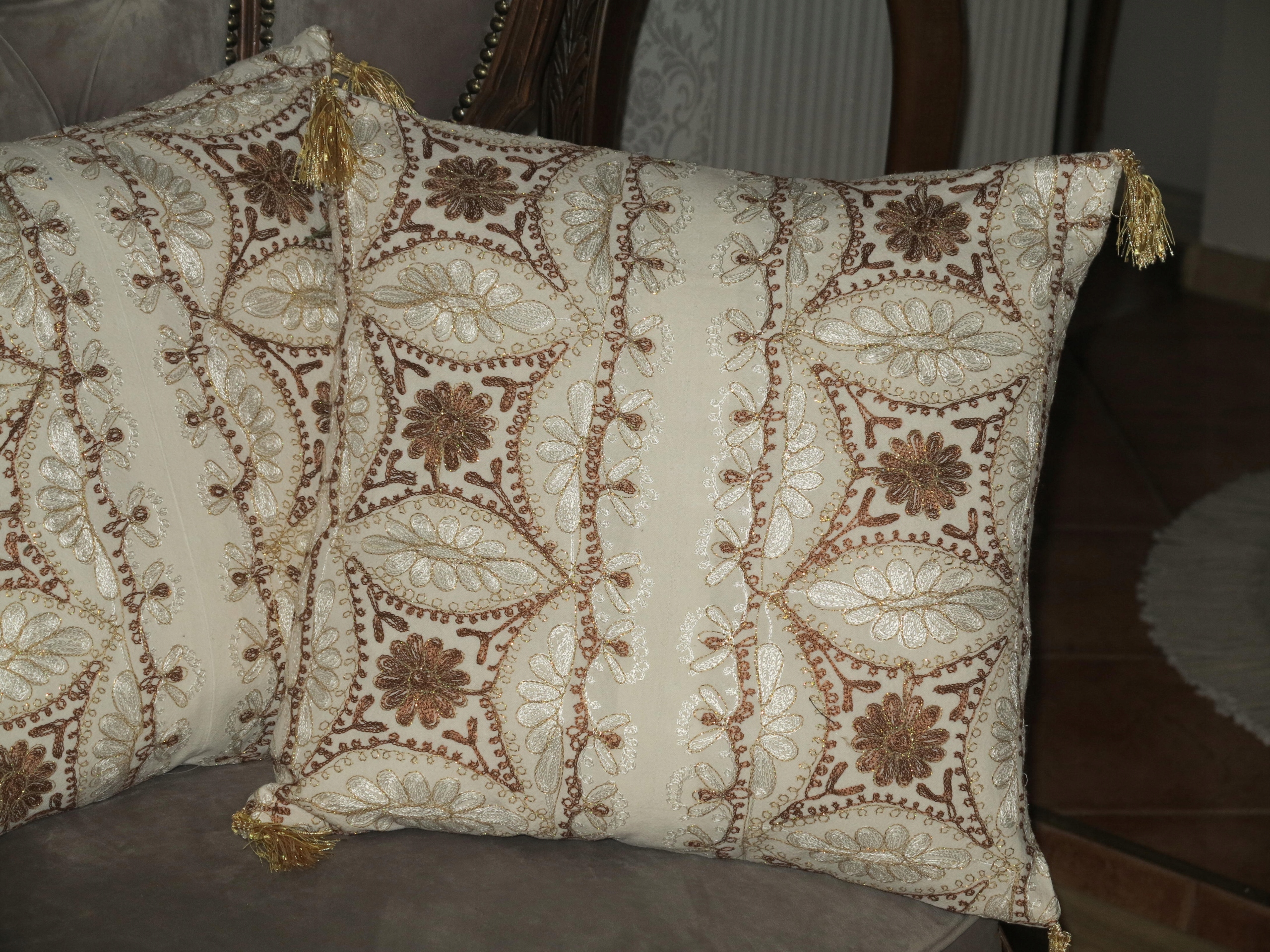 ПАЛАЦОВИЙ КОМПЛЕКТ, ЩО СКЛАДАЄТЬСЯ З ДВОХ ВЕЛИКИХ БАВОВНЯНИХ НАВОЛОЧОК З БАГАТО ІНТЕНСИВНОЇ ВИШИВКИ ЛАНЦЮЖКАМИ ЕКРЮ/КОРИЧНЕВОГО ТА ЗОЛОТА, ЗОЛОТИМИ БИРКАМИ НА КУТАХ ПОДУШОК