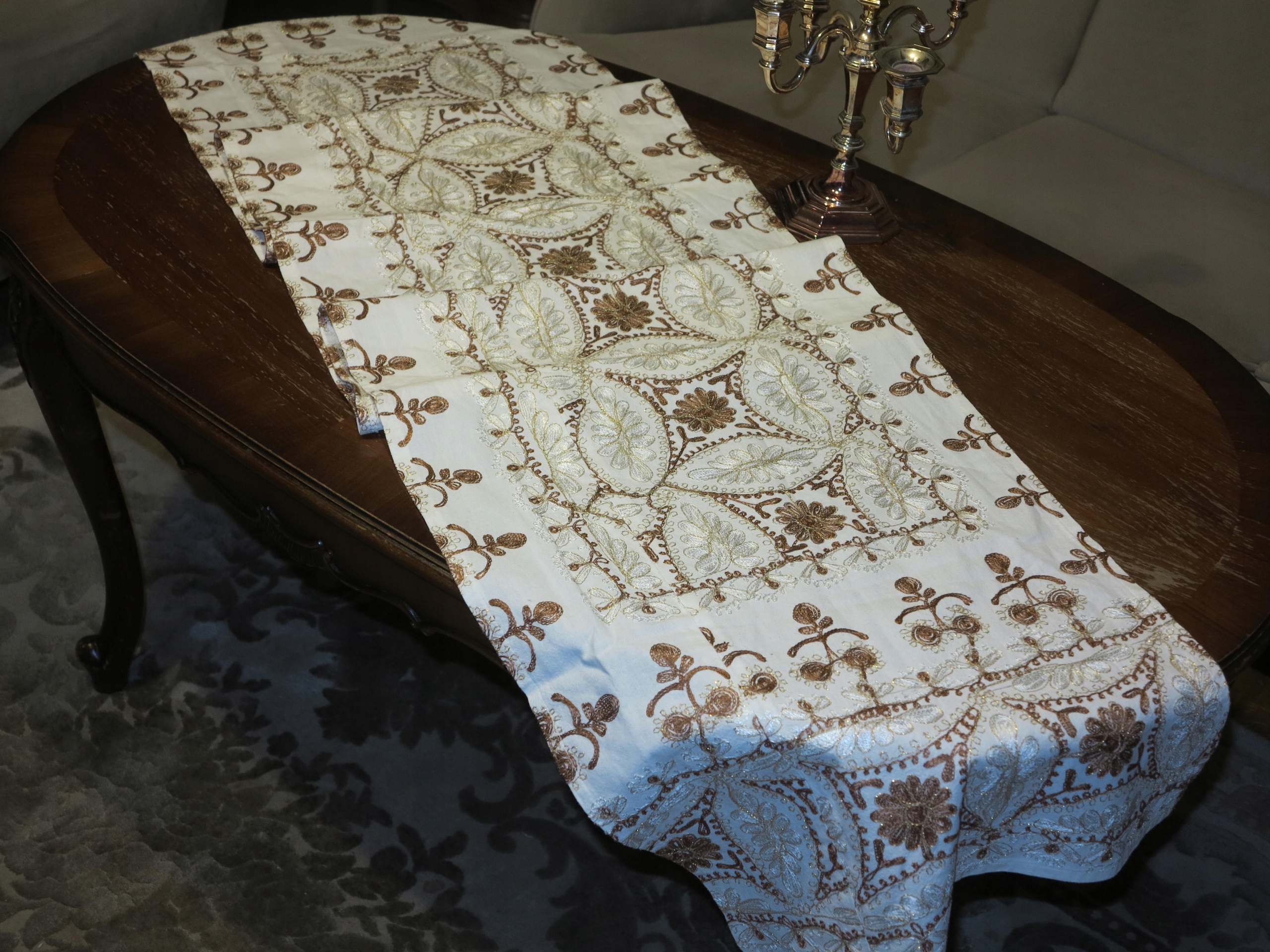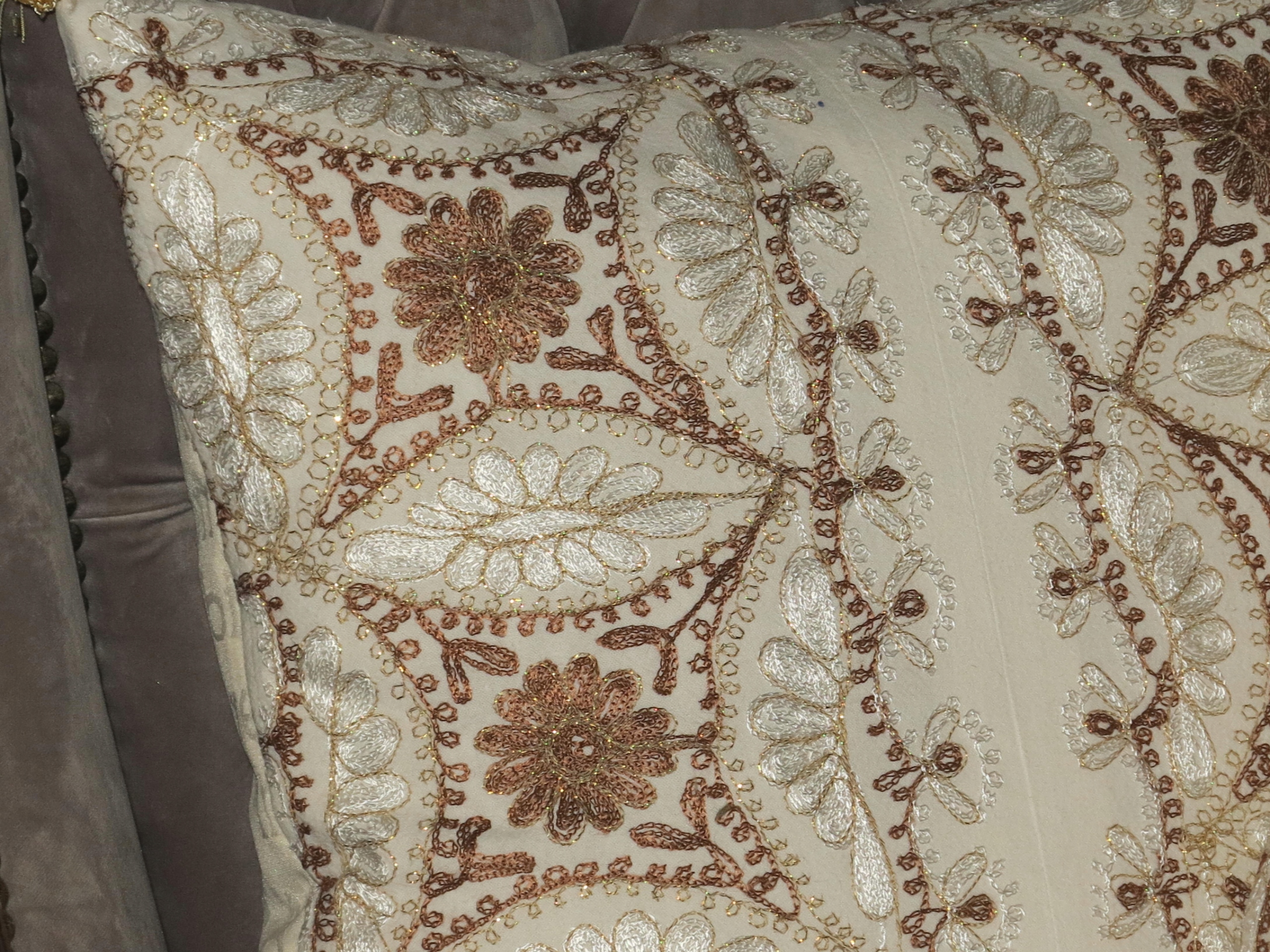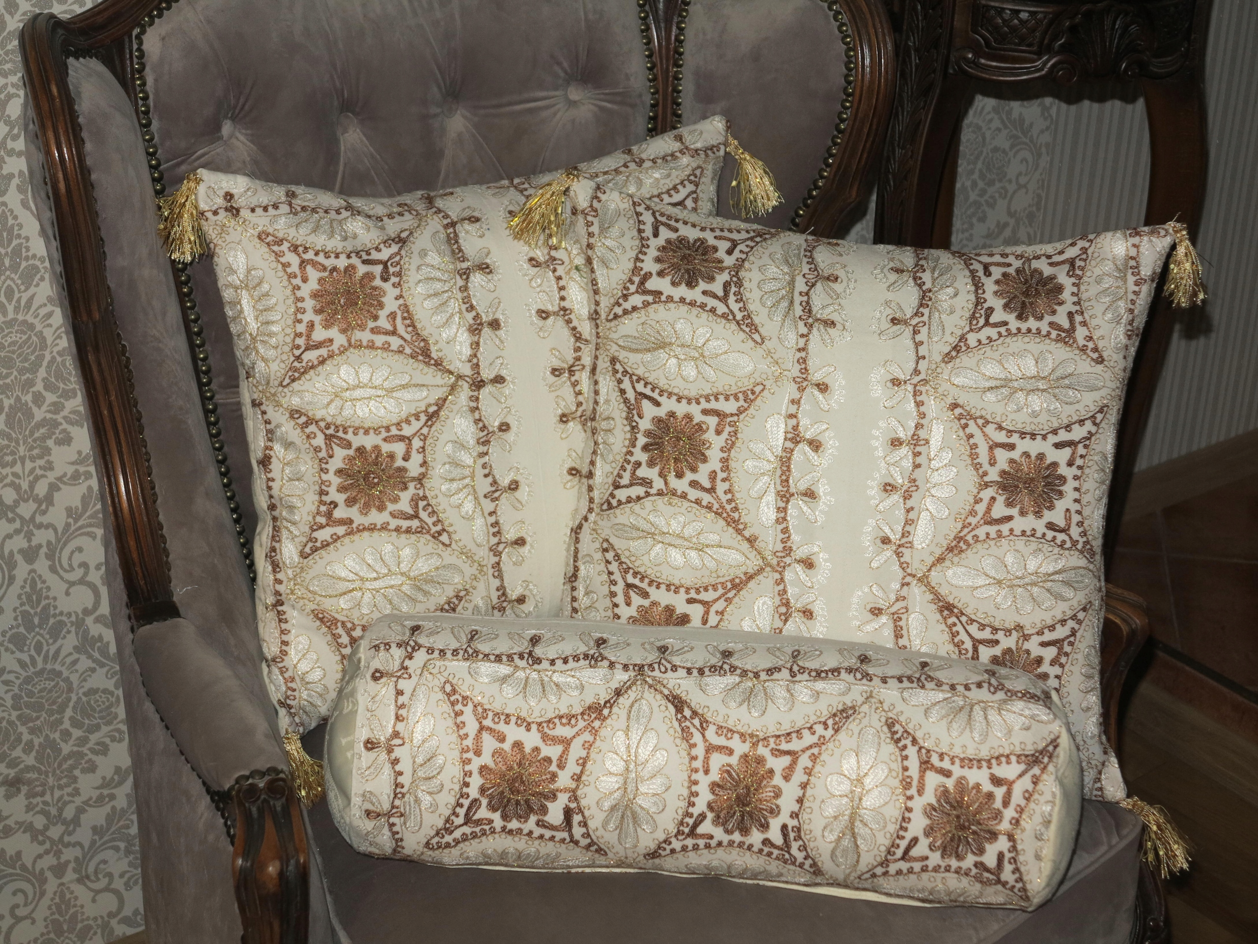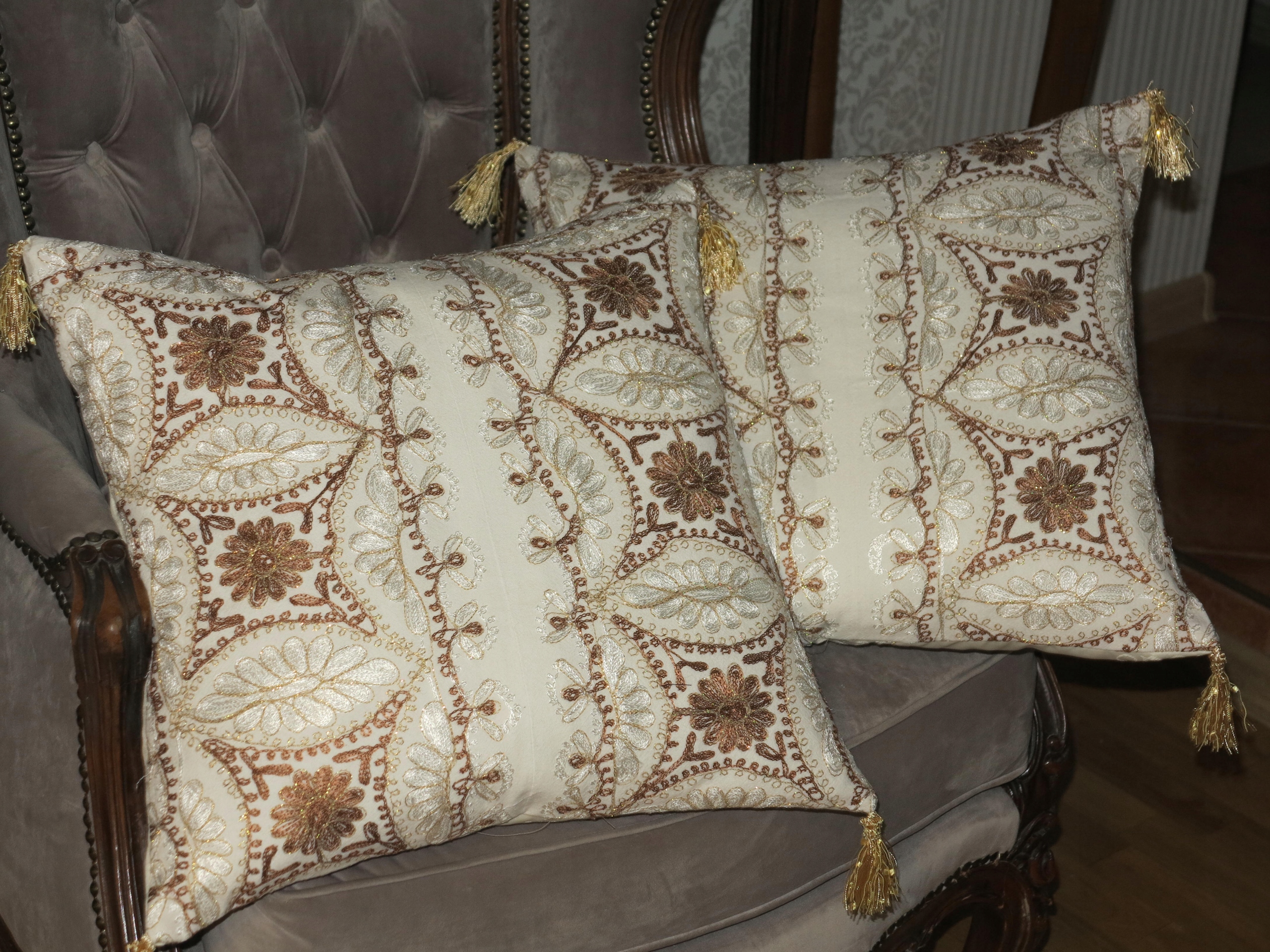 ПАЛАЦОВИЙ КОМПЛЕКТ, ЩО СКЛАДАЄТЬСЯ З ДВОХ ВЕЛИКИХ БАВОВНЯНИХ НАВОЛОЧОК З БАГАТО ІНТЕНСИВНОЇ ВИШИВКИ ЛАНЦЮЖКАМИ ЕКРЮ/КОРИЧНЕВОГО ТА ЗОЛОТА, ЗОЛОТИМИ БИРКАМИ НА КУТАХ ПОДУШОК