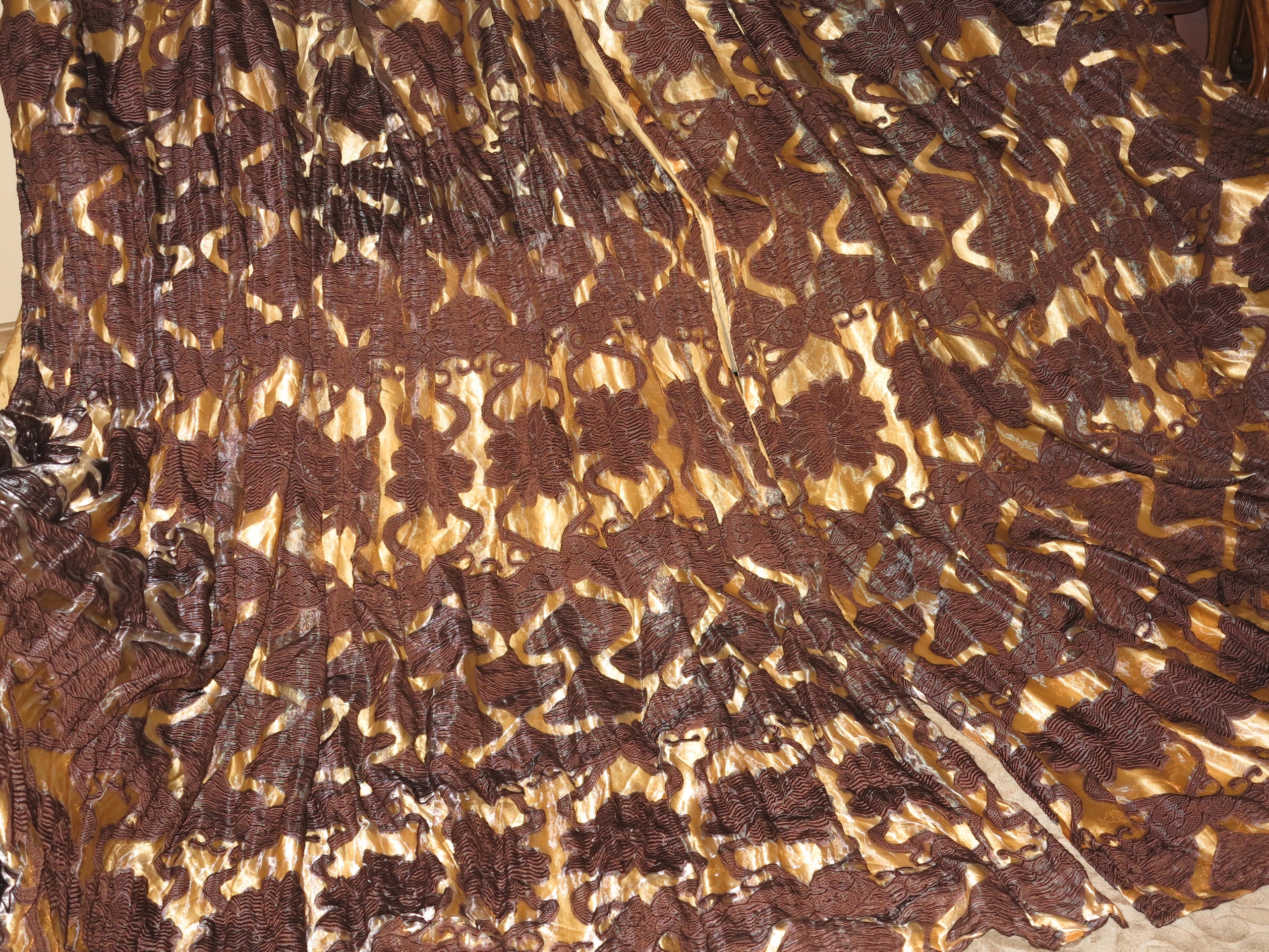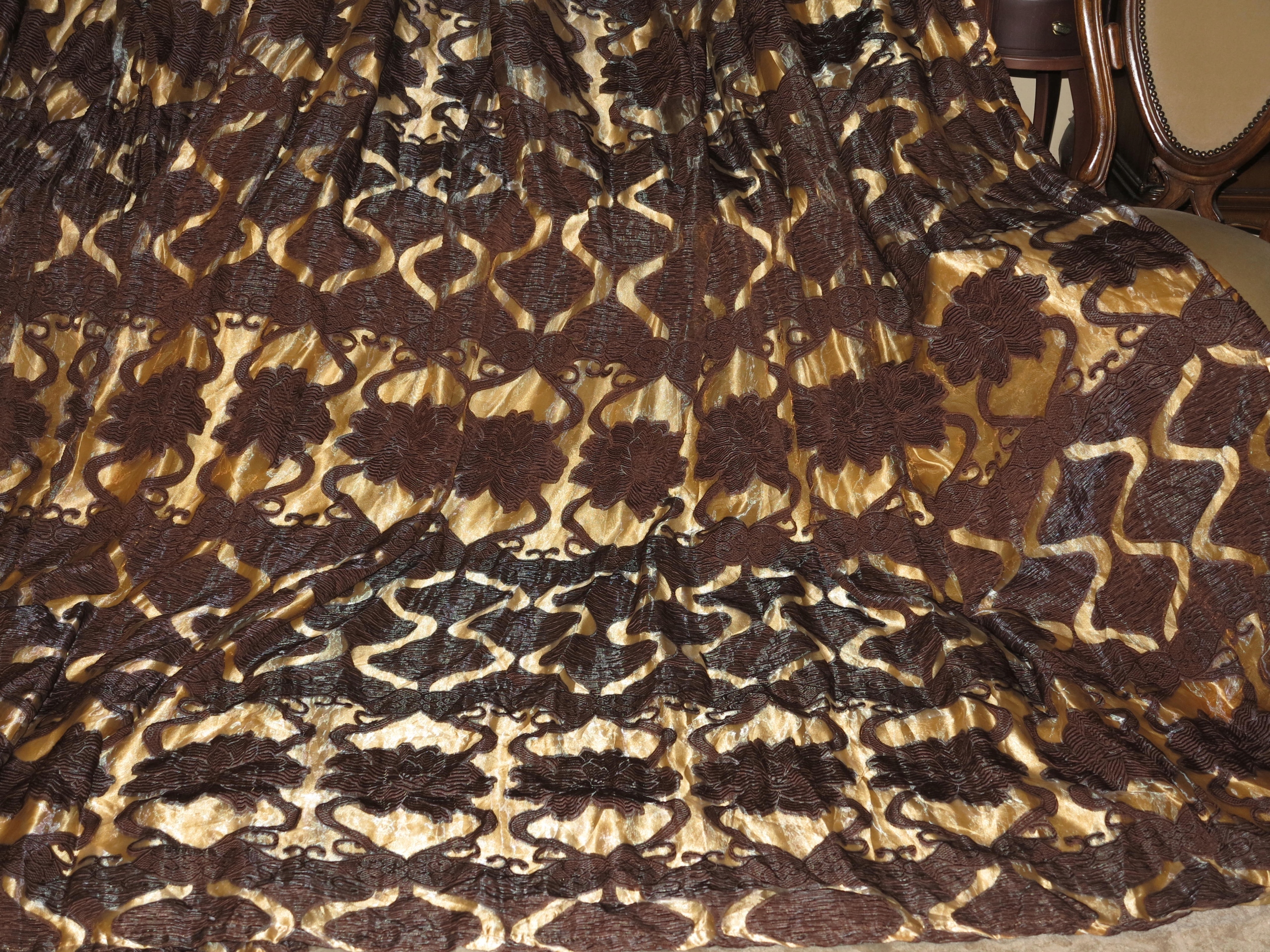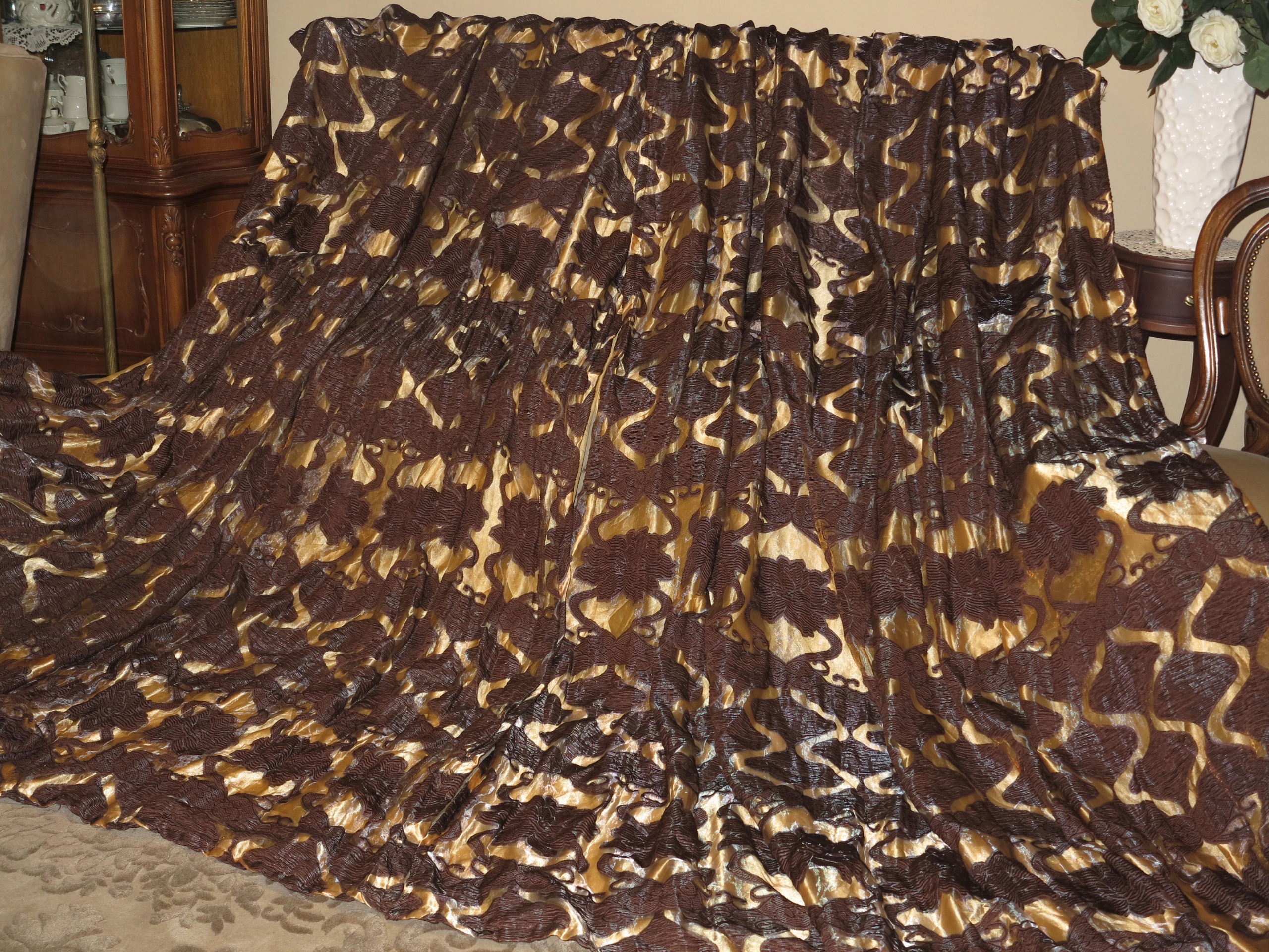 ПАТАЛИЧНІ ТА ДУЖЕ ДЕКОРАТИВНІ ВЕЛИЧЕЗНІ ШТОРИ, СКЛАДАЮТЬСЯ З ДВОХ ШАРІВ ТКАНИНИ, ЗШИТИХ МІЖ БІЧНИМИ КРАТЯМИ. З ЗОЛОТОГО АТЛАСУ І ЗЛІШКО ПРОЗОРИХ ЗОВНІШНІХ БРЮЧІВ З ОПУКЛИМИ СТИЛЬНИМИ ВІЗЕРОНАМИ. ЗОЛОТО ТА ТЕМНО-ШОКОЛАДНО-КОРИЧНЕВИЙ КОЛІР