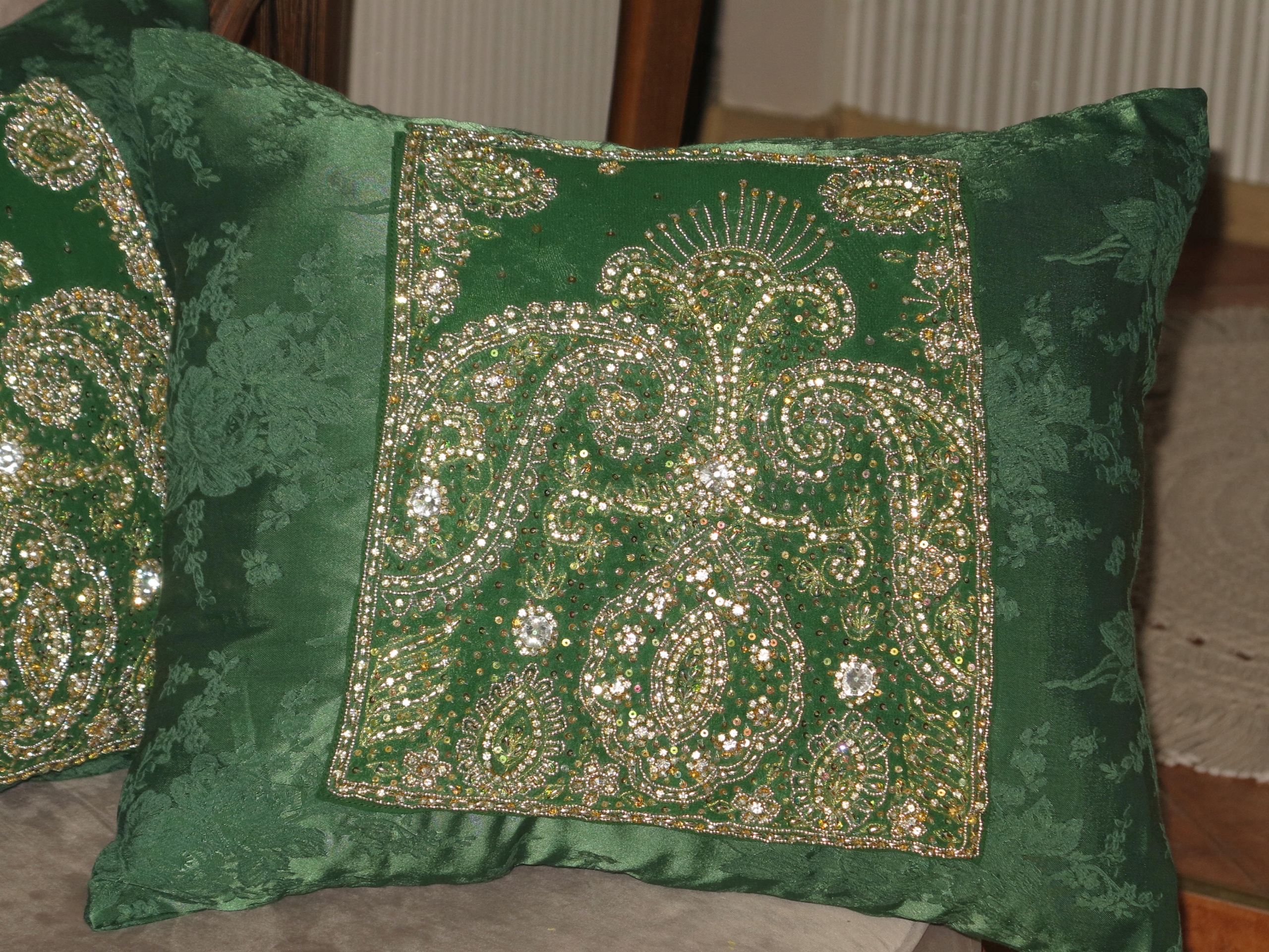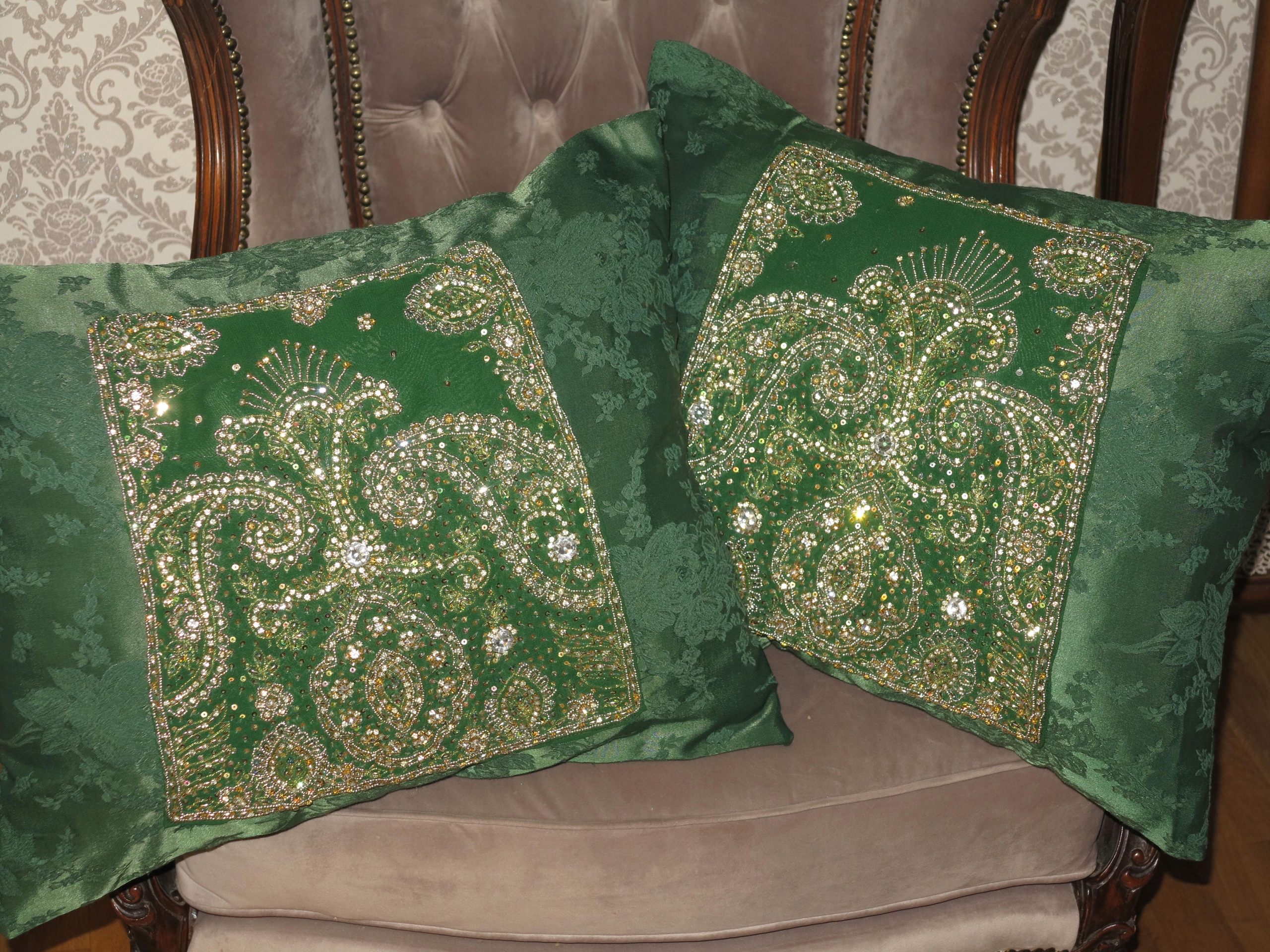 КРАСИВИХ ВЕЛИКИХ ПОДУШОК ПАЛАЦ, ПРИКРАШЕНИХ РУЧНОЮ ВИШИТІЮ БАГАТОЮ МАЛОЮ ЦИРКОНІЄМ, БЛИСКІТКАМИ ТА БІСЕРИНОМ. ПОДУШКИ ЗЕЛЕНОГО ТА ЗОЛОТОГО
