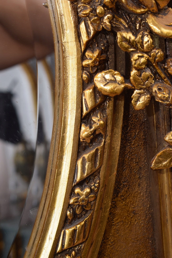 Представляємо вам розкішне, палацове дзеркало, яке вражає своєю витонченою формою та красивою золотою рамою. Цей унікальний декоративний елемент походить із Франції та випромінює класичний, королівський стиль.