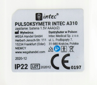 Пульсоксиметр A310 є сертифікованим медичним пристроєм, який відповідає таким стандартам: EN ISO 13485:2016, EN ISO 14971:2012, EN 1041:2008+A1:2013, EN ISO 15223- 1:2017 - Частина 1, EN ISO 10993-1:2009;