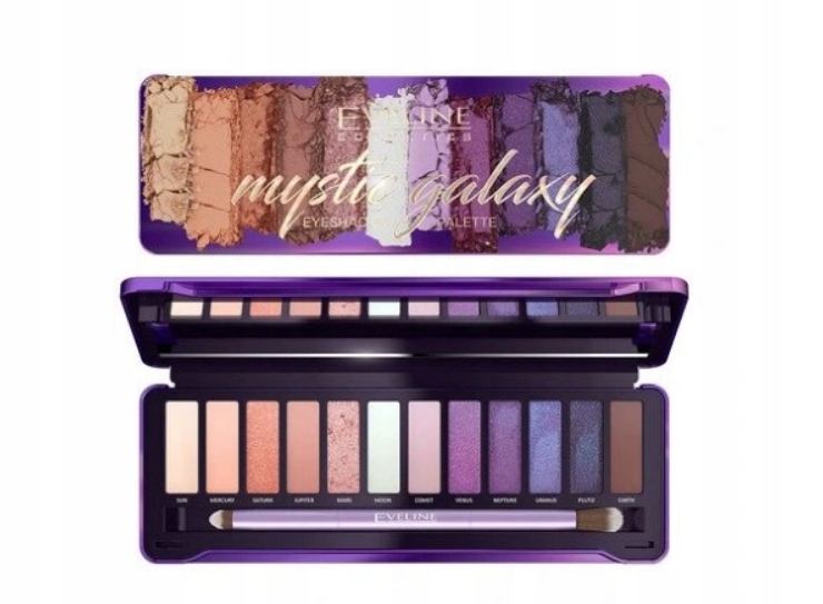 Палітра Mystic Galaxy Palette — це ідеально підібрана композиція з 12 тіней, натхненна барвами космосу. Це гармонійний набір матових і металевих кольорів, які ідеально поєднуються, а їх сильна пігментація дозволяє створити макіяж, про який мрієте! Тіні поміщені в елегантний металевий футляр з дзеркалом, який оснащений двостороннім пензликом, що дозволяє наносити тіні на всю верхню повіку або точно на нижню повіку і у внутрішніх куточках очей.