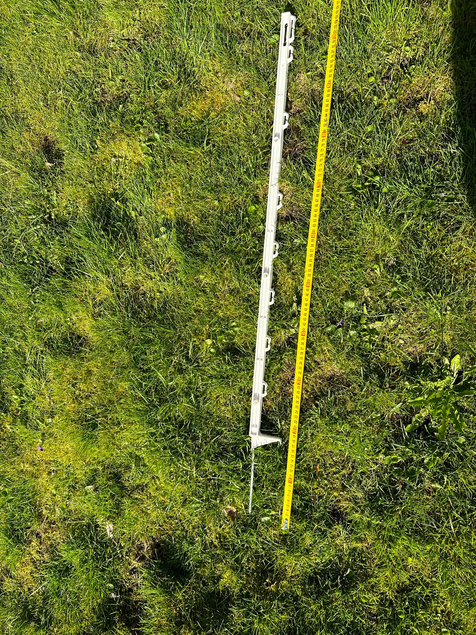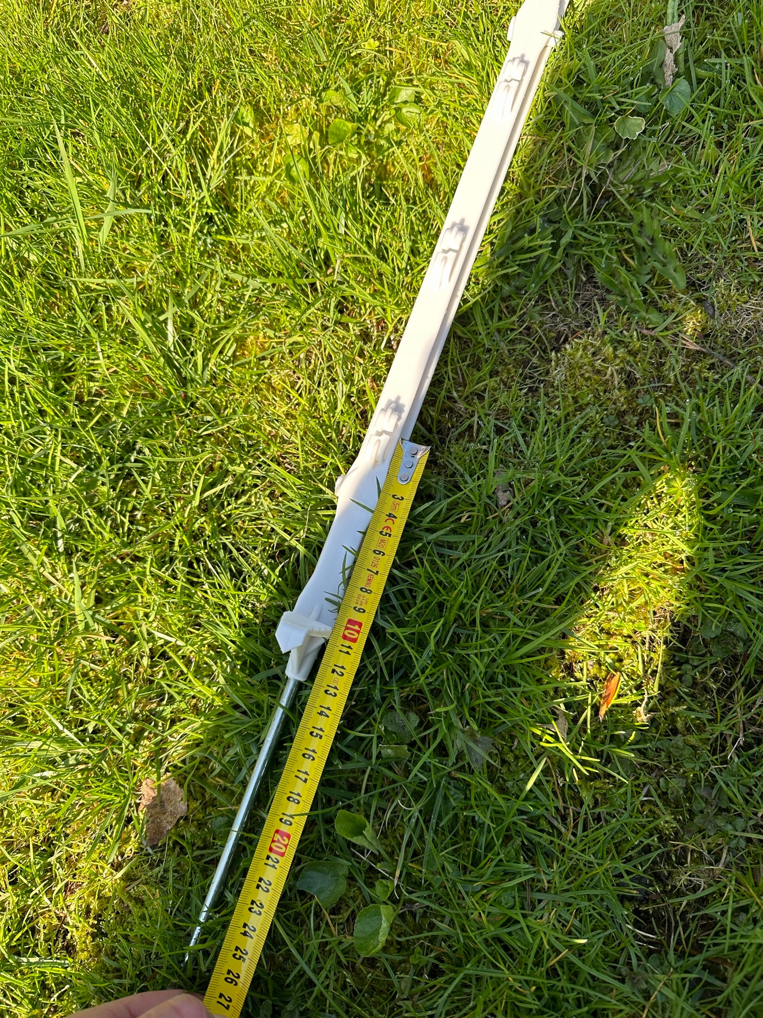 Перші п'ять кріплень від Землі знаходяться через кожні 10 см, наступне кріплення - кожні 15 см. Потім є ще одне кріплення 11 см, наступне один із сантиметровою відстанню, ширина кріплення 2 см, усі, крім кріплення вгорі. Верхнє кріплення 4,5 см. Крім того, стовп має отвори збоку, які також можна використовувати. Перший отвір 7 см. Від землі другий отвір 34 см. Від землі третій отвір 62 см. Від землі четверта яма - 84 см. Від землі довжина вбитих в землю елементів - 17,5 см.