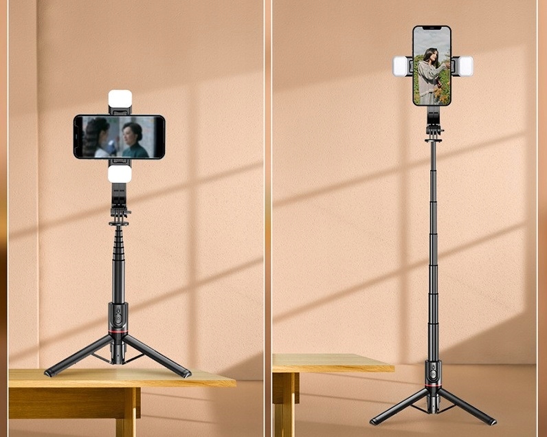 Бездротова Селфі-палка, вбудований штатив і лампа в одному. Унікальне поєднання стовпа зі штативом і лампами забезпечує неперевершений комфорт і зручність. Має висувну ручку та підставку, відкривається нижній штатив, можна використовувати як стаціонарний штатив.