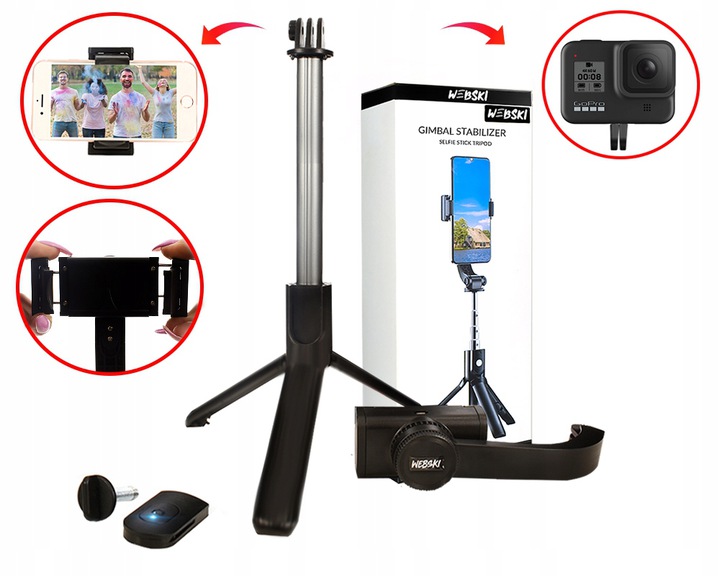 Веб-селфір-гімбал-палиця з бездротовим пультом дистанційного керування та складанням штатива для телефонів та спортивних камер.