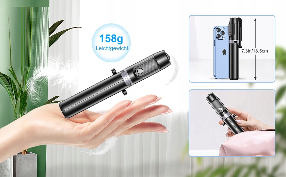 - Дизайн 3 в 1: палиця для селфі + штатив + пульт дистанційного керування Bluetooth