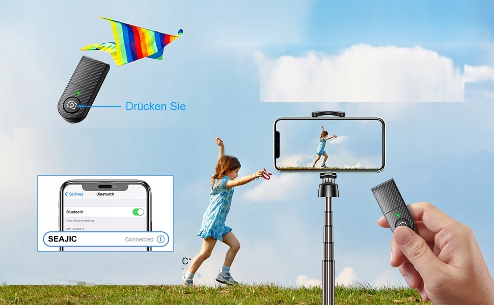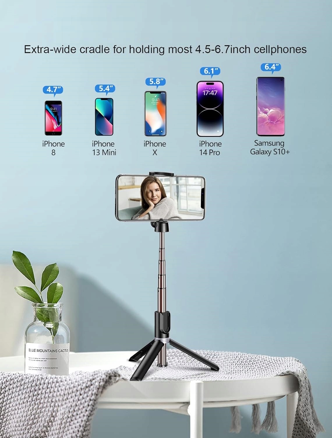 - Селфі-штатив із дистанційним керуванням . З цим селфі-штативом 3-в-1 із Bluetooth-пультом дистанційного керування ви можете мати вільні руки під час зйомки селфі, групових фото чи незабутніх відео. Немає необхідності окремо купувати палицю для селфі чи штатив.