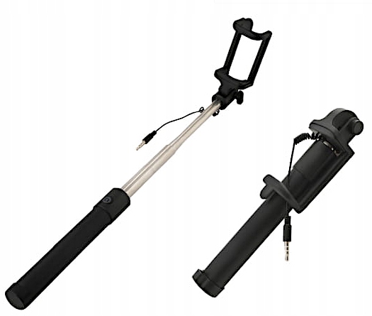 Універсальна селфі-палка з тригером - кнопка в ручці. Просто помістіть телефон у пружинне кріплення та підключіть його за допомогою кабелю miniJack.
