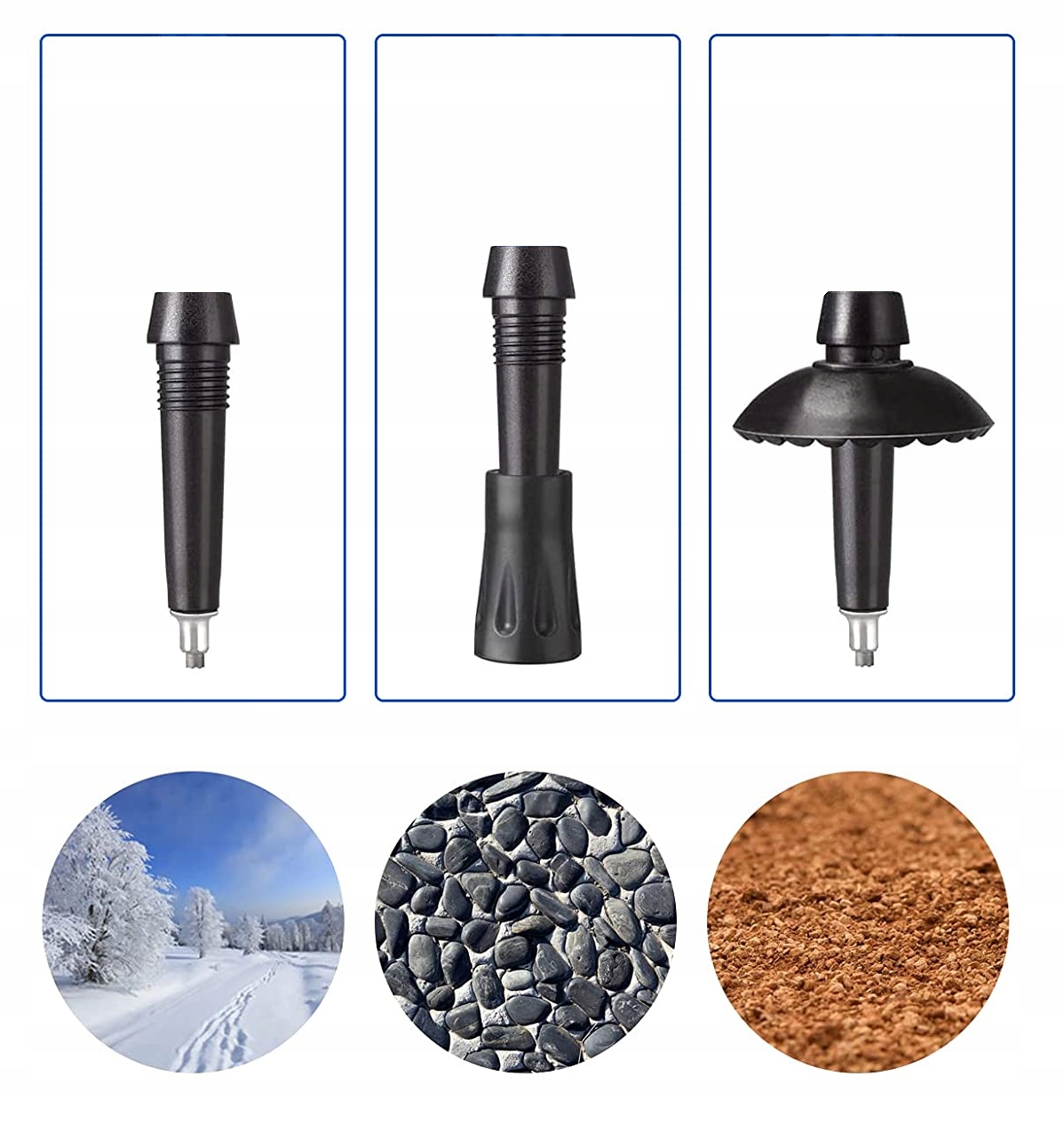 Палиці складаються з трьох основних частин : ручка, стрижень і наконечник. Ручка — це частина палиці, яку ви тримаєте в руці, зроблена з гуми для надійного захоплення. Стержень палиці виготовлений з алюмінію, а його довжина регулюється відповідно до росту користувача. Наконечник палиці виготовлений із пластику та має гумовий наконечник, який забезпечує зчеплення та амортизацію на складній місцевості.
