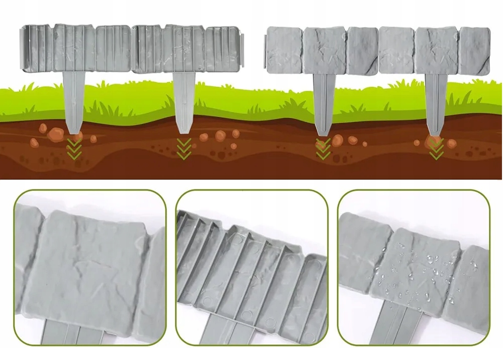 Садовий частокіл STONE швидко і легко встановлюється, може мати довільну форму (прямі ділянки, арки, кола), надаючи саду унікальний вигляд. Він відокремлює будь-які місця в саду, де висаджені рослини або розташовані елементи садової архітектури. Він імітує камінь, не гниє і стійкий до погодних умов.