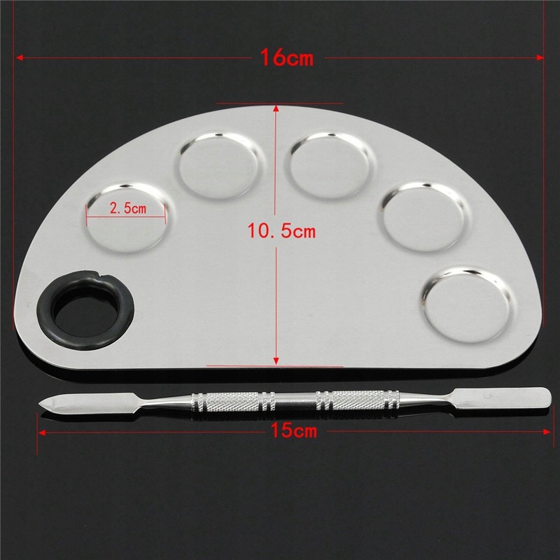 Професійна палітра з нержавіючої сталі для змішування засобів для укладання нігтів і косметики. У комплект палітри входить двостороння накатка. Палітра має 5 виїмок і отвір, що дозволяє легко захоплювати і тримати палітру в руці. На палітрі можна змішувати засоби для укладання нігтів - гелі, акрил і лаки, а також косметичні засоби, такі як основа, камуфляж, кремова і напіврідка косметика. Включена накатка є ідеальним інструментом для дозування, нанесення та змішування продуктів. Ви також можете використовувати його для створення манікюру. Для професійного та домашнього використання. Це значно прискорює та полегшує роботу. Піддон можна мити та дезінфікувати.