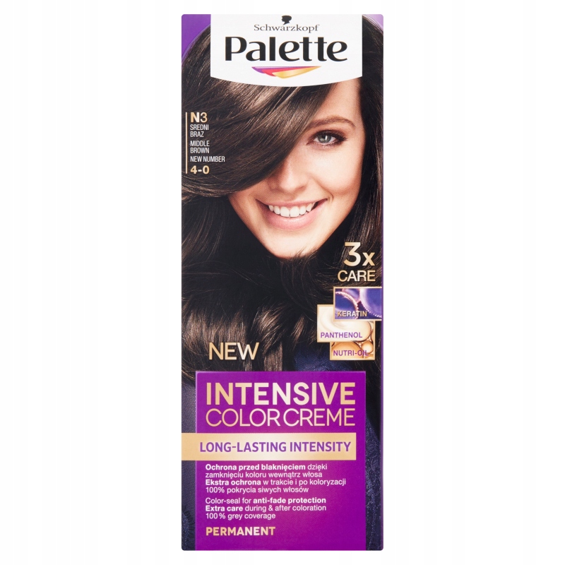 - Стійкий та інтенсивний освітлювач Додатковий догляд під час і після фарбування Формула з інтенсивними пігментами глибоко проникає в структуру волосся, фіксуючи колір всередині та захищаючи його від вицвітання. Для довготривалої інтенсивності кольору та освітлення до 5 відтінків. Формула Palette у поєднанні з доглядовою маскою з системою Triple Care System - креатин, пантенол і зволожуючі масла - подбають про ваше волосся. До 20% інтенсивніший догляд*: зміцнене та розгладжене волосся для красивого та довготривалого кольору. *порівняно з попередньою формулою Виберіть продукт, який забезпечить вам бажаний рівень стійкості кольору: 3. Стійкий колір
