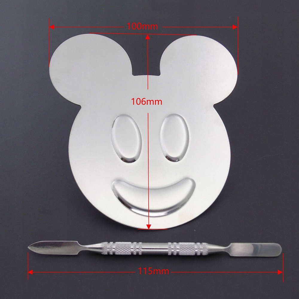 Професійна палітра Міккі Мауса, виготовлена з нержавіючої сталі для змішування продуктів у стилі нігтів та косметики. До палітри прикріплений подвійний вміння. Палітра має 3 порожнини. На палітрі ви можете змішати продукти укладання нігтів - гелі, акриліки та лаки, а також косметику, такі як фундаменти, камуфляжа, крем та косметика напівлікіда. Прикріплений вміння ідеально підходить як інструмент для надання, нанесення та змішування продуктів. Ви також можете використовувати його для створення манікюру. Для професійного та домашнього використання. Він прискорюється і полегшує роботу. Палітру можна мити і дезінфікувати.