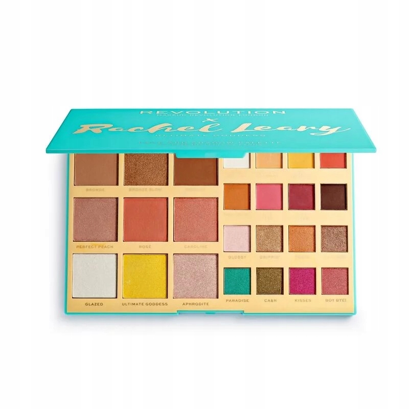 Makeup Revolution Rachel Leary Ultimate Goddess Palette створено у співпраці з британською ютуберкою Рейчел Лірі, торговою маркою якої є сяючий макіяж із використанням великої кількості хайлайтера та бронзера . Палітра містить пресовану косметику, необхідну для макіяжу обличчя та очей. І все це в одній палітрі.Завдяки цій палетці можна створити як денний нейтральний образ, так і вечірній smoky eye. З цією палеткою у вас є вся косметика, необхідна для створення ідеального макіяжу очей і контуру обличчя. Все це укладено в елегантну палітру, оснащену повнорозмірним дзеркалом.