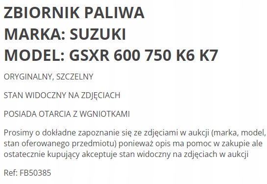 Просматривая «Топливный бак Bak Suzuki GSXR 600 750 K6-K7», вы можете быть уверены, что данный товар из каталога «Топливные баки» будет доставлен из Польши и проверен на целостность. В цене товара, указанной на сайте, учтена доставка из Польши. Внимание!!! Товары для Евросоюза, согласно законодательству стран Евросоюза, могут отличаться упаковкой или наполнением.