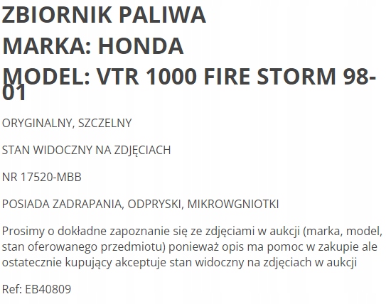 Оплачивая «ТОПЛИВНЫЙ БАК HONDA VTR 1000 FIRE STORM 98-01», вы можете быть уверены, что данное изделие из каталога «Топливные баки» будет доставлено из Польши и проверено на целостность. В цене товара, указанной на сайте, учтена доставка из Польши. Внимание!!! Товары для Евросоюза, согласно законодательству стран Евросоюза, могут отличаться упаковкой или наполнением.