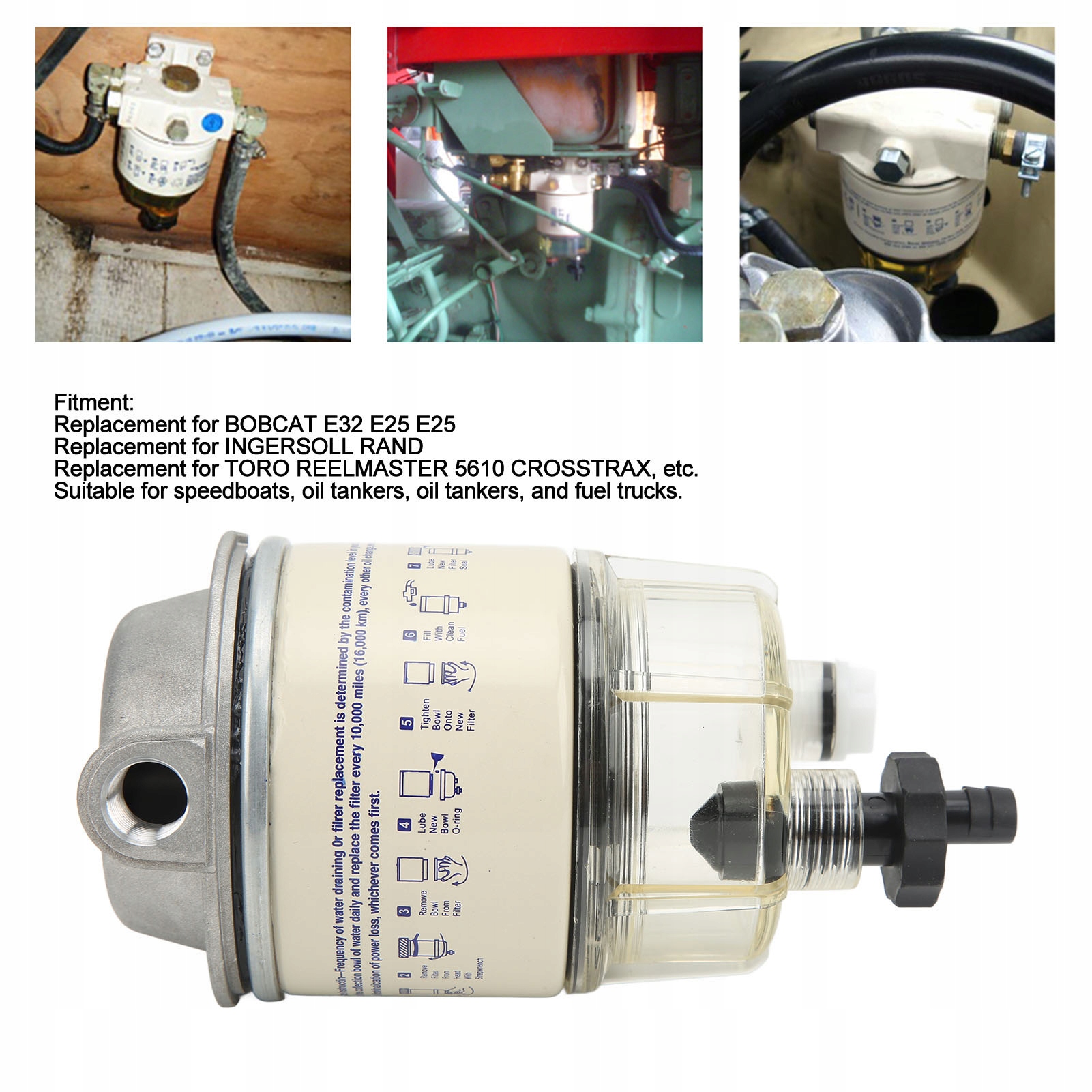 2. Ширина застосування: номер деталі R12T, сепаратор паливної води підходить для моторних човнів, танкерів, нафтових танкерів і бензовозів.