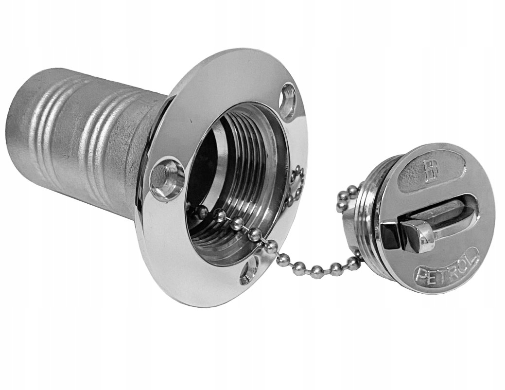 Виготовлена з кислотостійкої сталі, паливна горловина для бензинової яхти. Ковпачок має язичок, що обертається, тому для його відкручування не потрібен важіль. Висока якість виготовлення.