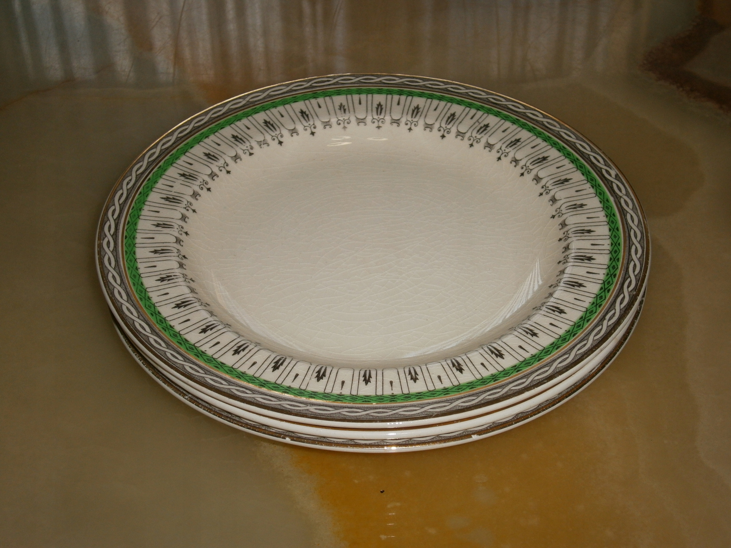 світло-кремовий екрю, колір оздоблення зелений із золотою смугою та чорним візерунком, маса з підглазурними павуками, в тому числі з затемненням, позолота злегка потерта, без пошкоджень та тріщин, без царапин