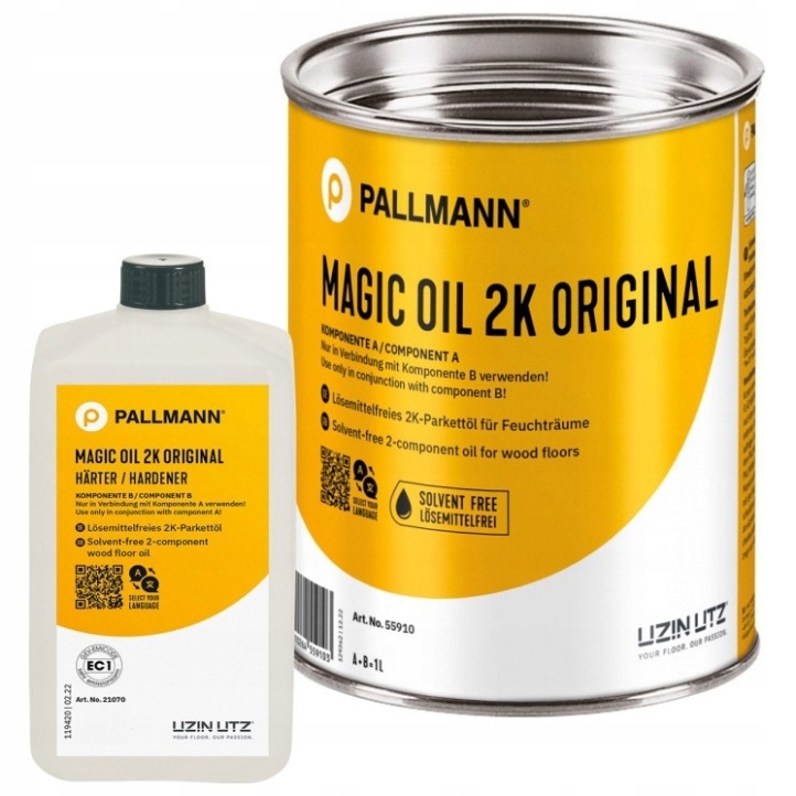 Pallmann Magic Oil 2K — найпопулярніший у світі двокомпонентний масло-віск. Протягом багатьох років воно славиться своєю максимальною твердістю та високою стійкістю до стирання. Це суміш масло-воск, яка гарантує збереження оксамитово-матової, відкрито-пористої, дихаючої та дифузної поверхні підлоги.