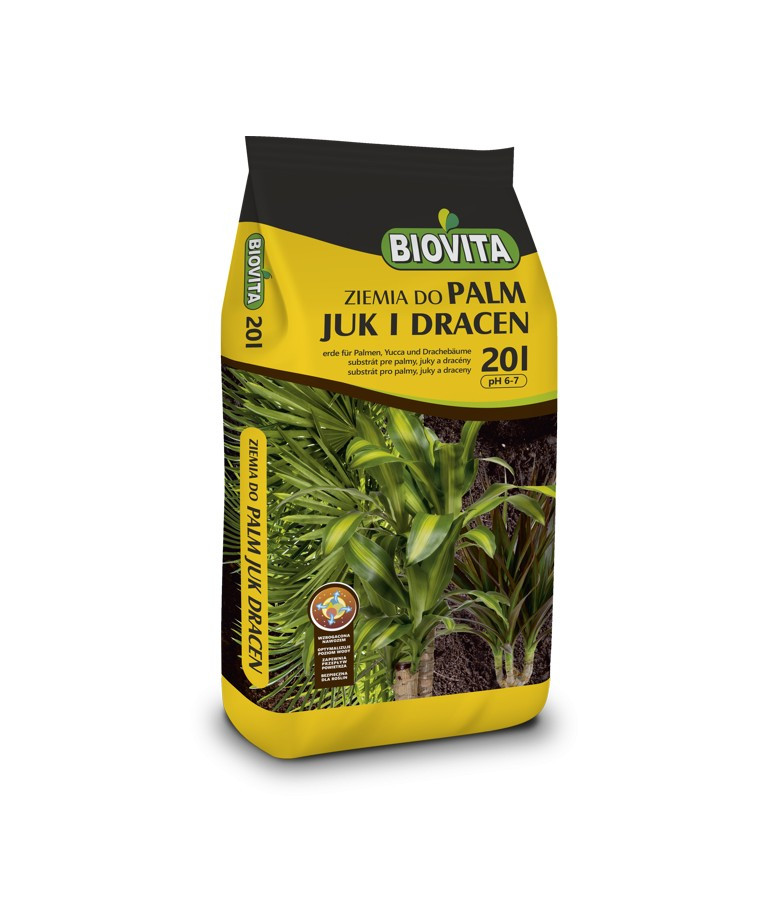 Ґрунт для пальм, юк і драцен BIOVITA - це готовий до використання перевірений багатокомпонентний субстрат, призначений для пальм, юк і драцен, а також для фікусів та інших зелених рослин. Правильно підібраний хіміко-фізичний склад створює сприятливі умови для розвитку і вегетації рослин. Додавання перліту забезпечує необхідну водопроникність для цих рослин. Так як пальми «не люблять стояти у воді», варто використовувати дренажний шар на дні горщика, наприклад керамзит «Біовіта», протягом повного періоду вегетації рослини необхідно регулярно поливати і удобрювати, взимку припиняємо внесення добрив і обмеження поливу.