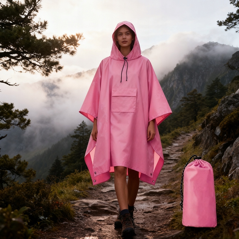 Це дощове пончо виготовлено з легкого, але міцного поліестеру, що не розривається. Усі шви герметизовані водонепроникним матеріалом, щоб уникнути протікання. Кожен кут посилено люверсами, а з боків додано кнопки преміум-класу для забезпечення стабільності під час вітру. Капюшон має країну для кращої видимості під дощем.