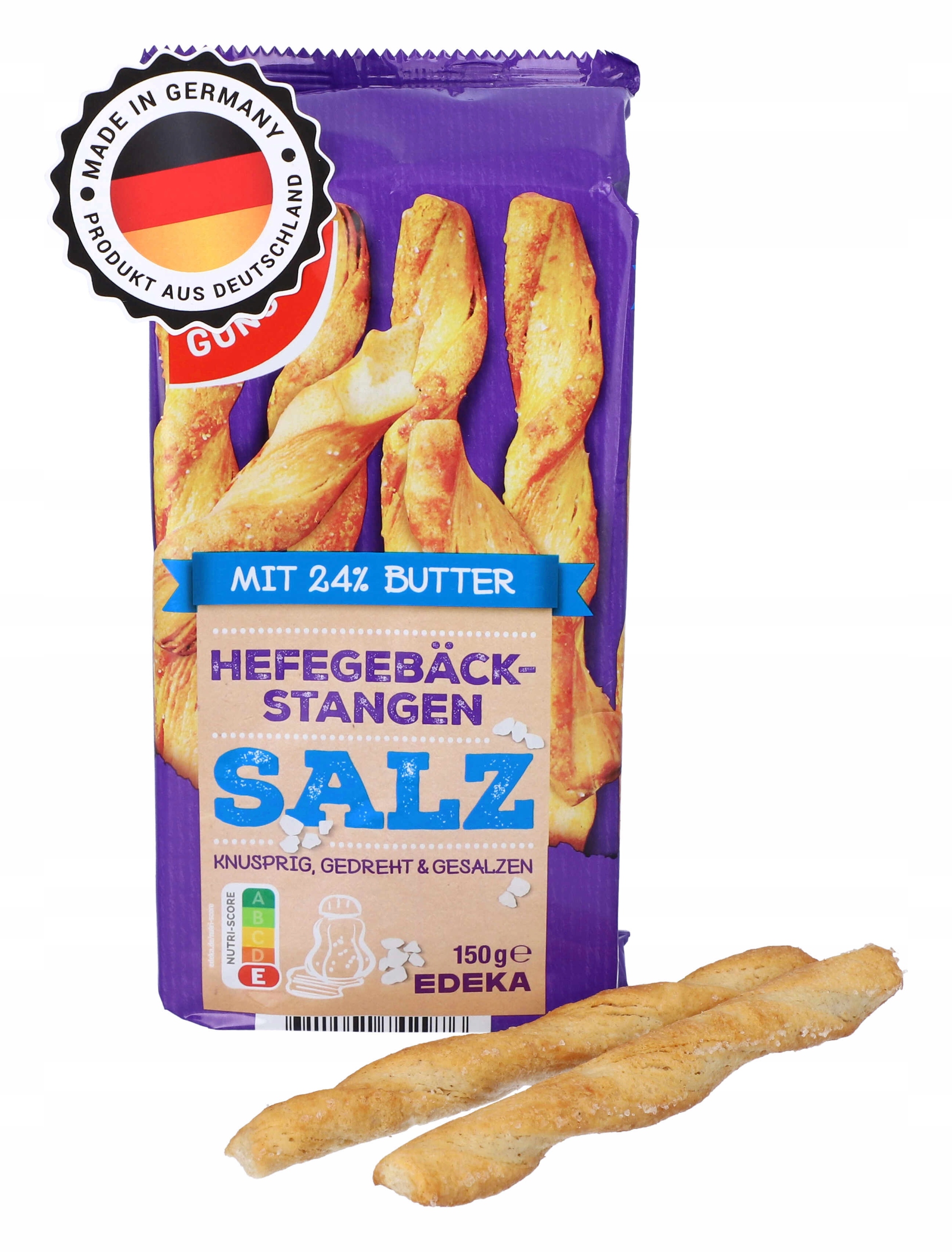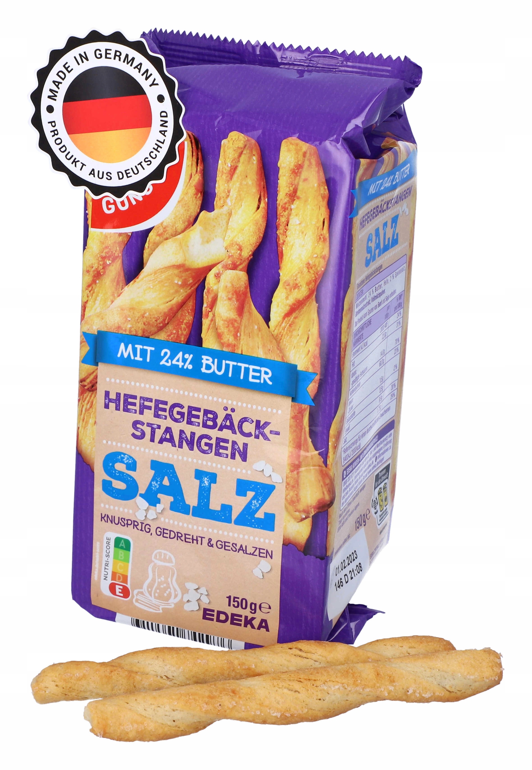 Солоні пшенично-дріжджові палички з маслом. Смачні, хрусткі палички з крупною сіллю люблять усі. Сирні палички Edeka ідеально підійдуть як закуска на вечірці або під час поїздки за місто. Оригінальний смак, який викликає звикання після першого смаку!
