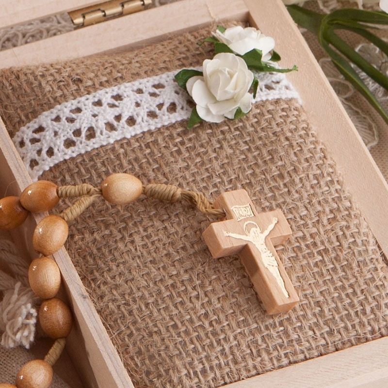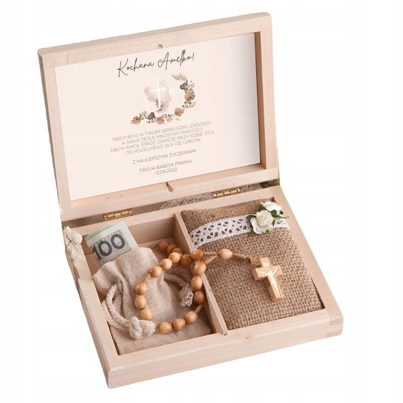 PAMIĄTKA Chrztu IMIĘ drewniany różaniec worek Boho